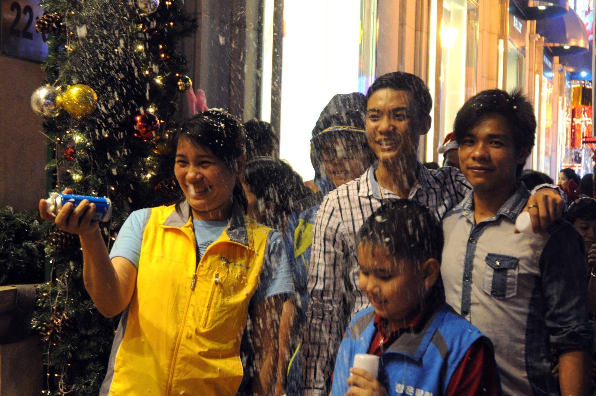 | Thời tiết tại Sài Gòn mát mẻ, giới trẻ thỏa sức nô giỡn với bình tạo bọt tuyết bán nhiều bên đường. Ảnh: Nguyễn Quang. |