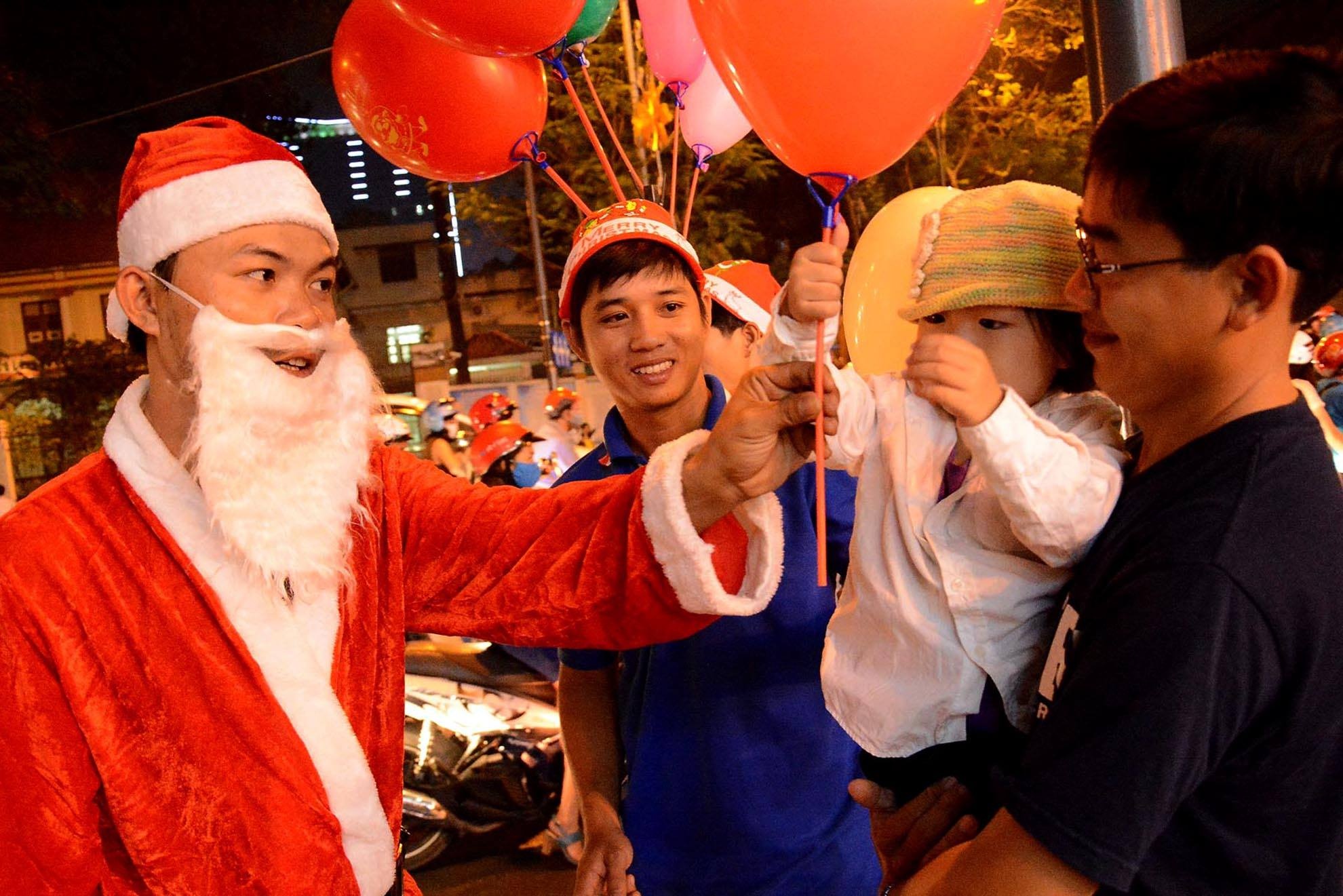 | Người dân đổ ra đường đón Giáng sinh sớm. Người bán bóng bay, chụp ảnh trong vai ông già Noel tập trung gần các TTTM và nhà thờ Đức Bà. Ảnh: Minh Thanh. |