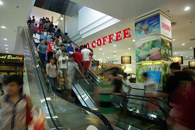 | Sau cơn mưa buổi sáng, chiều 1/9 nhiều người đổ về khu trung tâm vui chơi mua sắm dưới lòng đất Royal City. Cảnh tượng đông nghẹt như thế này kéo dài đến tận 20h tối. |