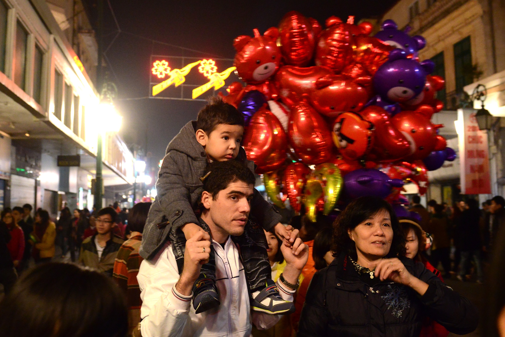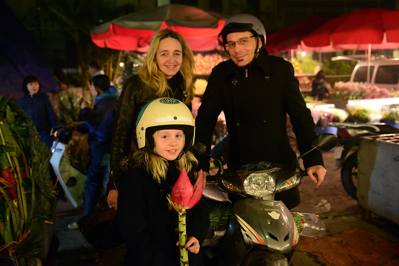 Một gia đình người nước ngoài sinh sống ở Hà Nội đi chợ hoa đêm. Ảnh: Tuấn Mark.