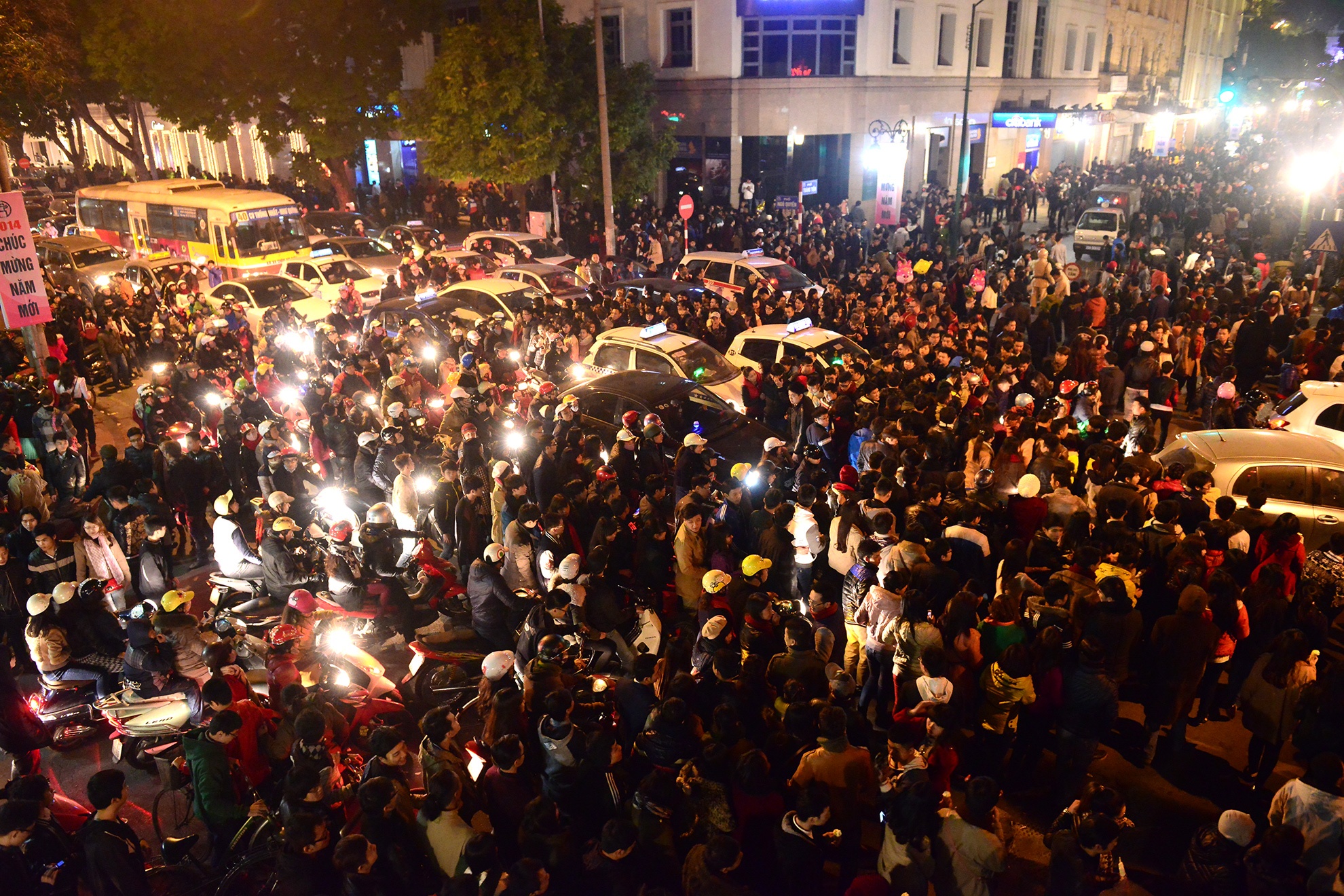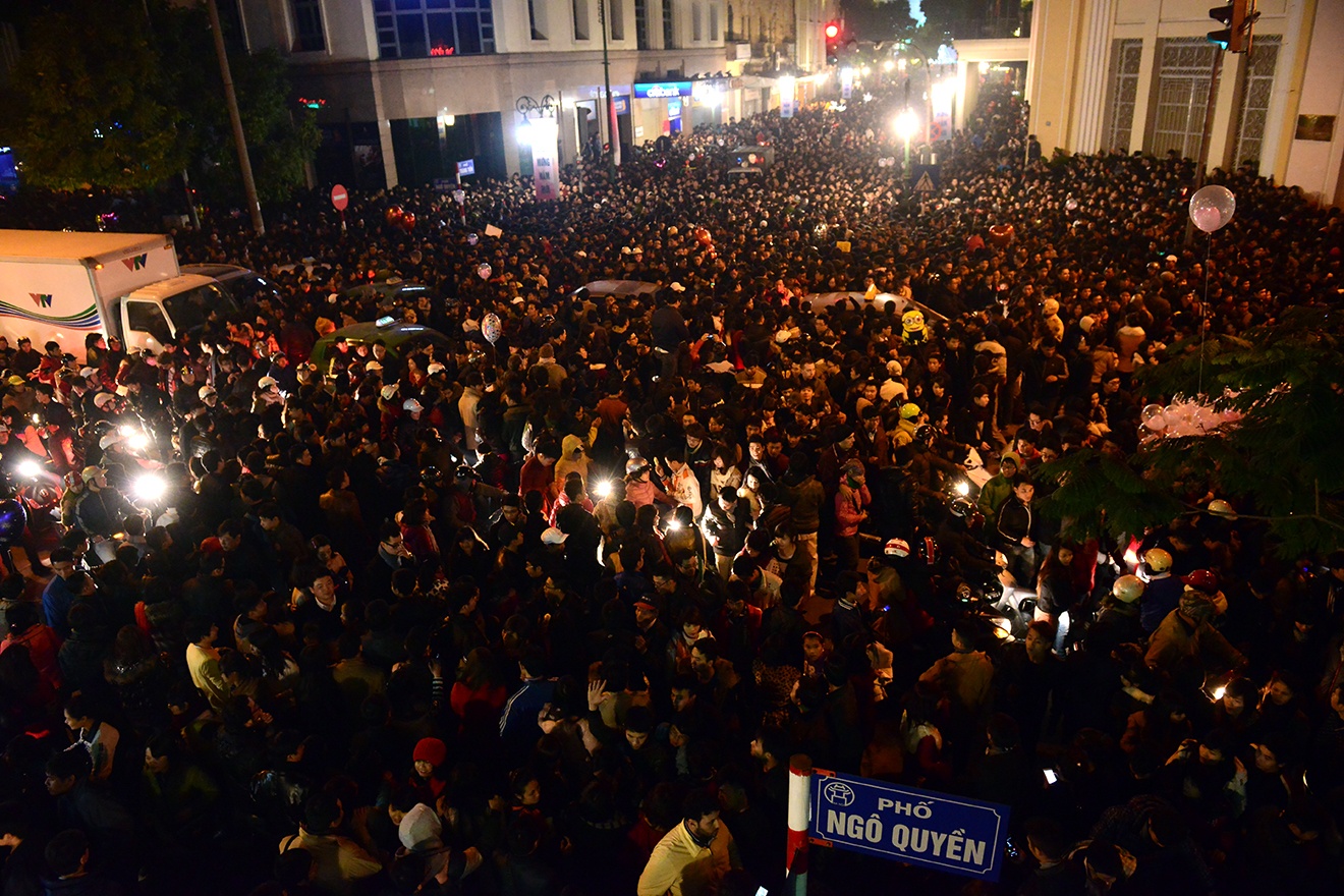 Biển người tại khu vực Nhà hát Lớn, đoạn ngã 6 Ngô Quyền, Phan Chu Trinh, Tràng Tiền lúc 23h đêm 31/12. Ảnh: Tuấn Mark.