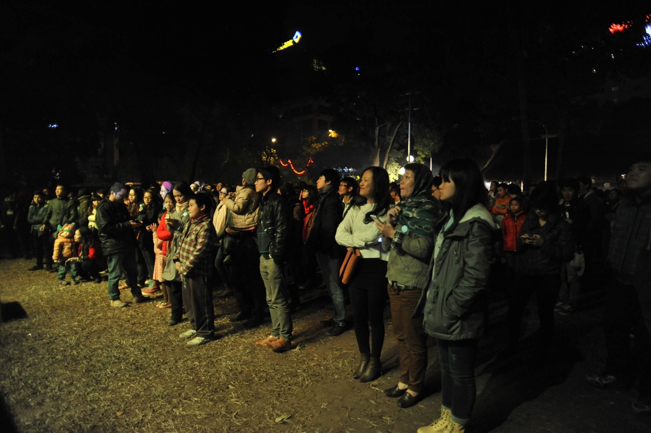 Tối nay, Hà Nội lạnh 12 độ C, nhiều người mặc áo ấm đứng xem các tiết mục nghệ thuật đường phố. Ảnh: Tuấn Mark.
