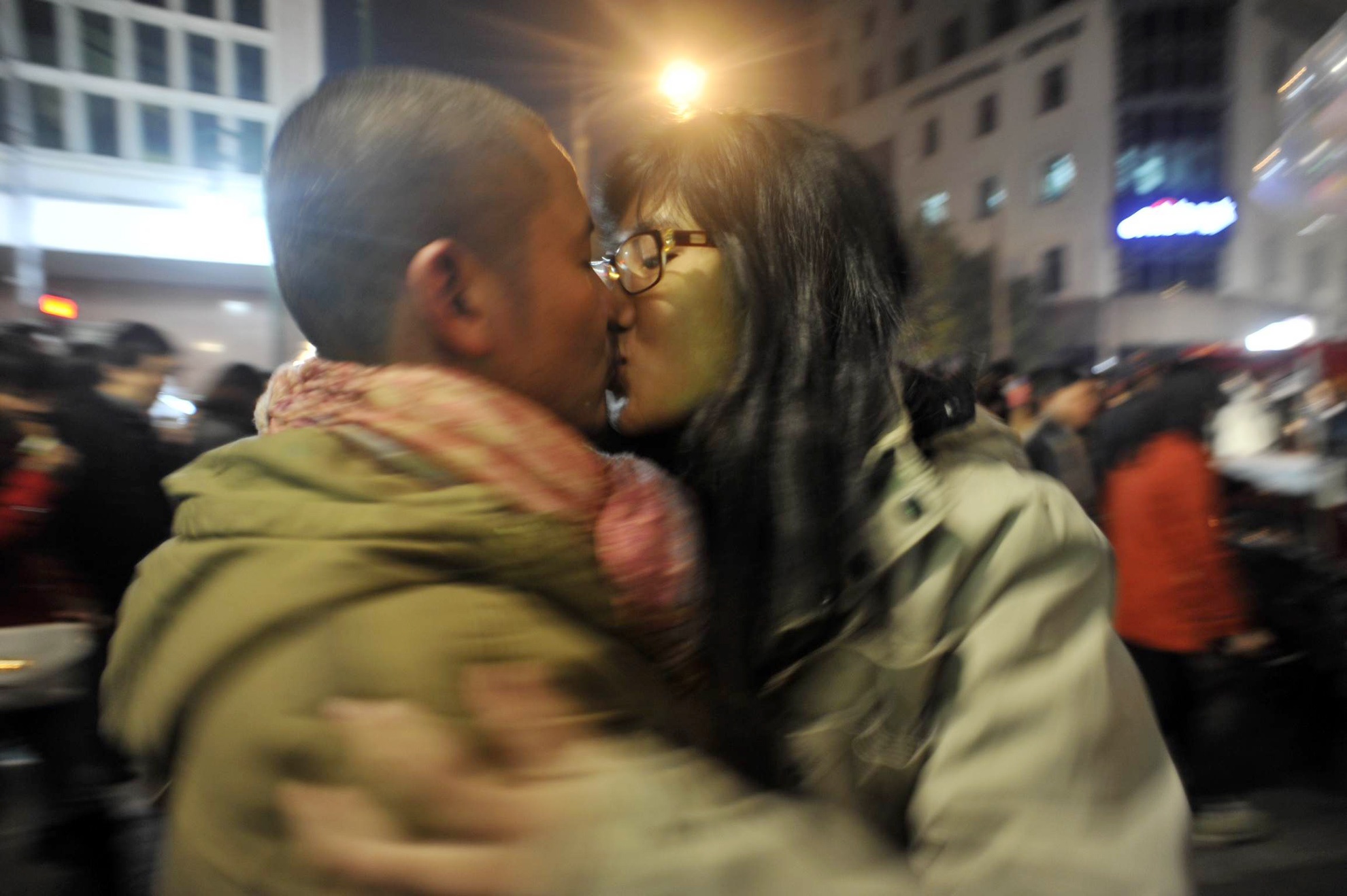 Một đôi bạn trẻ trao nhau nụ hôn nồng nàn trước thời khắc chuyển giao năm cũ, năm mới. Ảnh: Hoàng Anh.