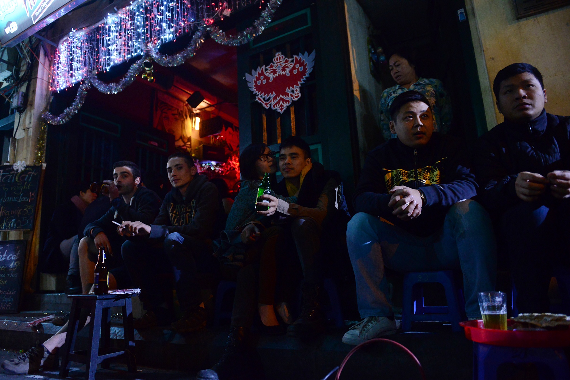 'Phố Tây' Tạ Hiện, giới trẻ ngồi thưởng thức đồ uống và cảm nhận không khí đêm cuối năm. Ảnh: Tuấn Mark.