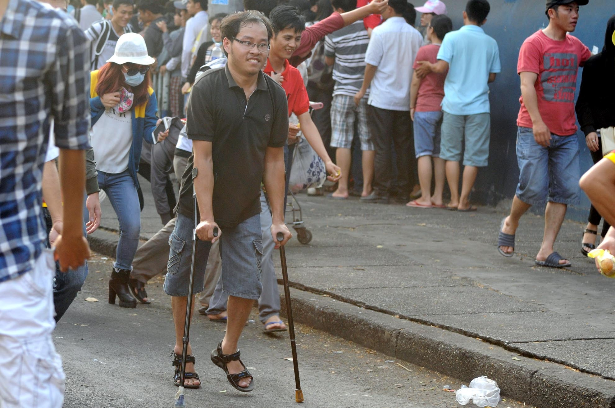 | Anh Hải (27 tuổi) gặp khó khăn trong việc đi lại nhưng vì đam mê bóng đá, anh vẫn cùng bạn bè cổ vũ Olympic Việt Nam. Tuy nhiên, khi trận đấu diễn ra gần hết hiệp 1, anh vẫn không thể vào sân. |