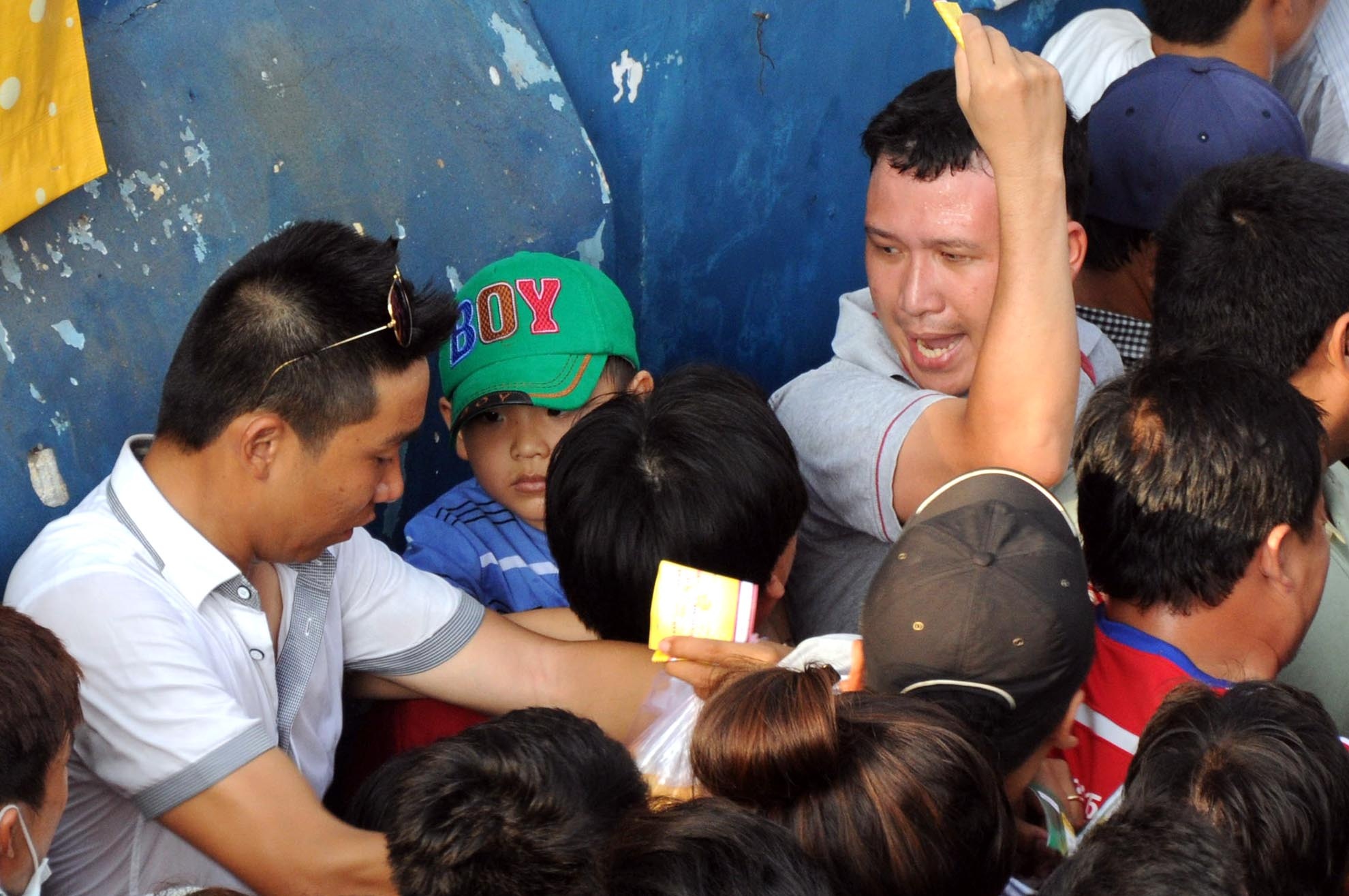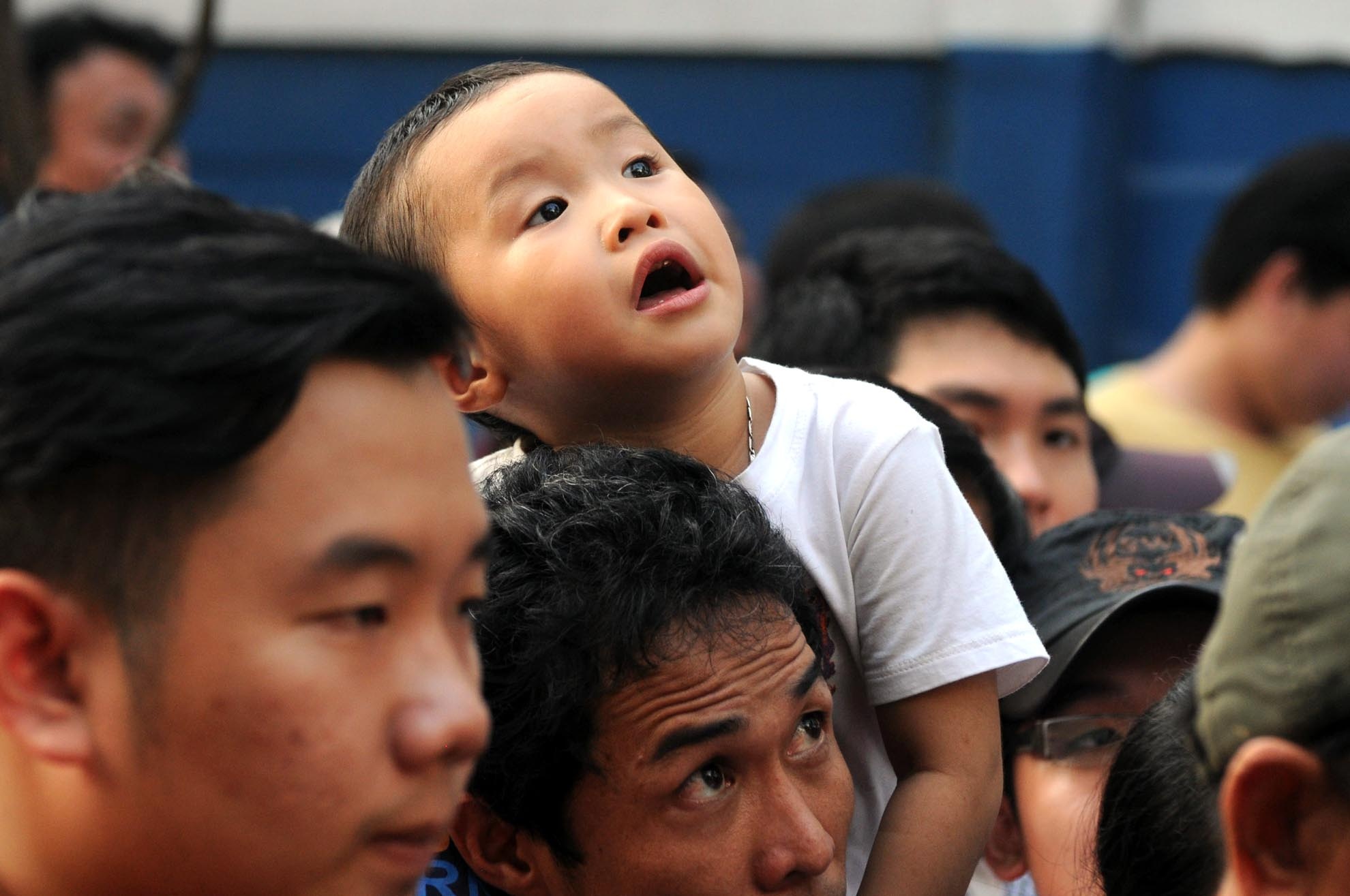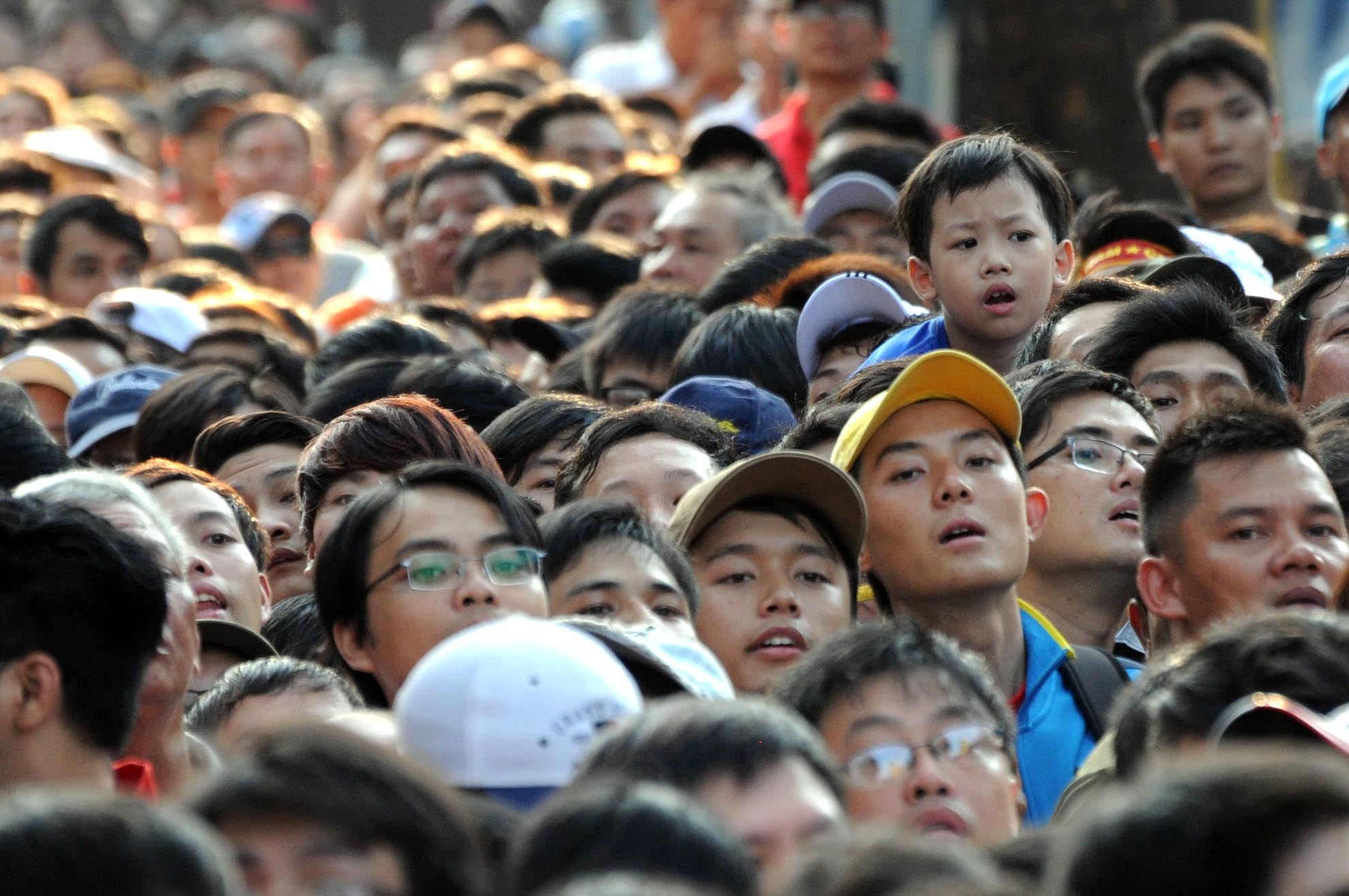 | Những em bé được ba mẹ dẫn theo cũng tỏ ra khá mệt mỏi và ngạc nhiên trước dòng người đông nghẹt. |
