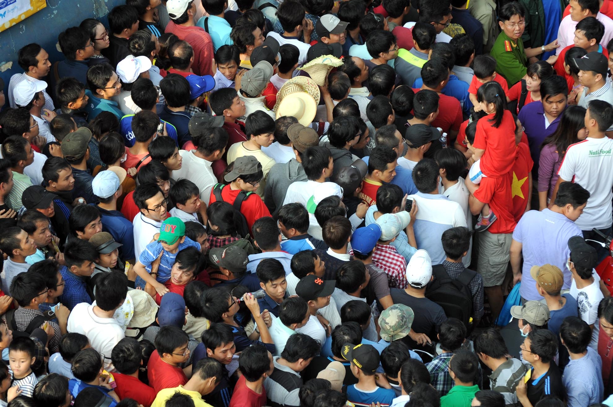 | Ai cũng nôn nóng muốn vào sân sớm, khiến tình trạng chen lấn, xô đẩy xảy ra. Nhiều người bỏ xếp hàng tràn ra đường gây kẹt xe nghiêm trọng. |