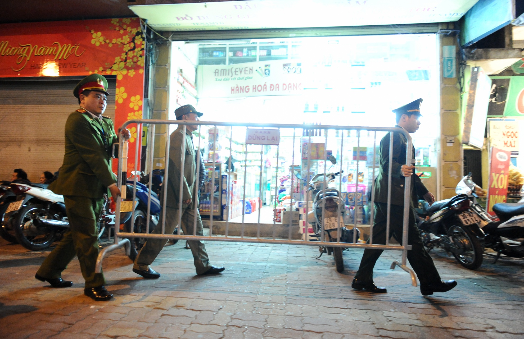 | Gần 1 km lòng đường Tây Sơn, đoạn gần Ngã Tư Sở được công an phong tỏa phục vụ nhà chùa và người dân. |