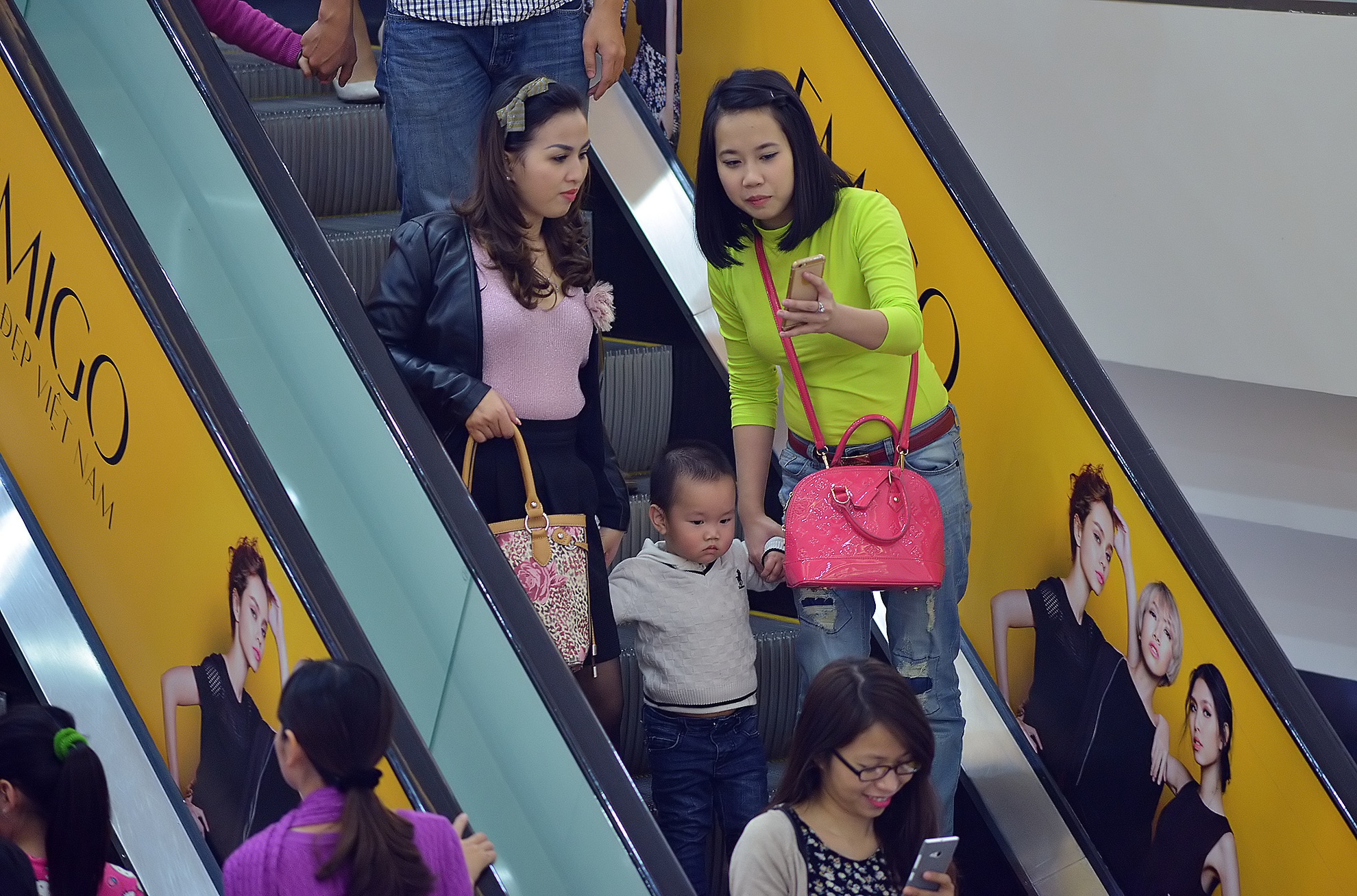 Bên trong Royal City chật cứng người tại các lối đi lại.Nhiều người tranh thủ mua sắm, vui chơi đầu năm.