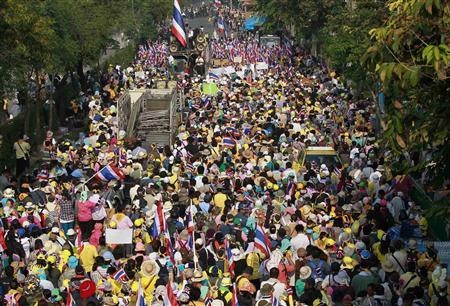 | Khoảng 100.000 tới 200.000 người tham gia cuộc tuần hành tới trụ sở chính phủ Thái Lan hôm nay. Họ chia thành 9 đoàn dưới sự chỉ đạo của một tổ chức mang tên Ủy ban Cải cách Dân chủ Nhân dân. Tất cả các đoàn đều tiến về trụ sở chính phủ. Ảnh: Reuters |