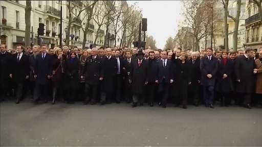 | Cuộc tuần hành bắt đầu lúc 15h (21h giờ Hà Nội). Tổng thống Pháp và các lãnh đạo thế giới trực tiếp xuống đường tuần hành cùng người dân Paris. Ảnh: BBC |