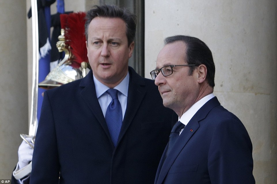 | Thủ tướng anh David Cameron (trái) đứng cạnh Tổng thống Pháp Francois Hollande trước giờ mít tinh. Ảnh: AP |