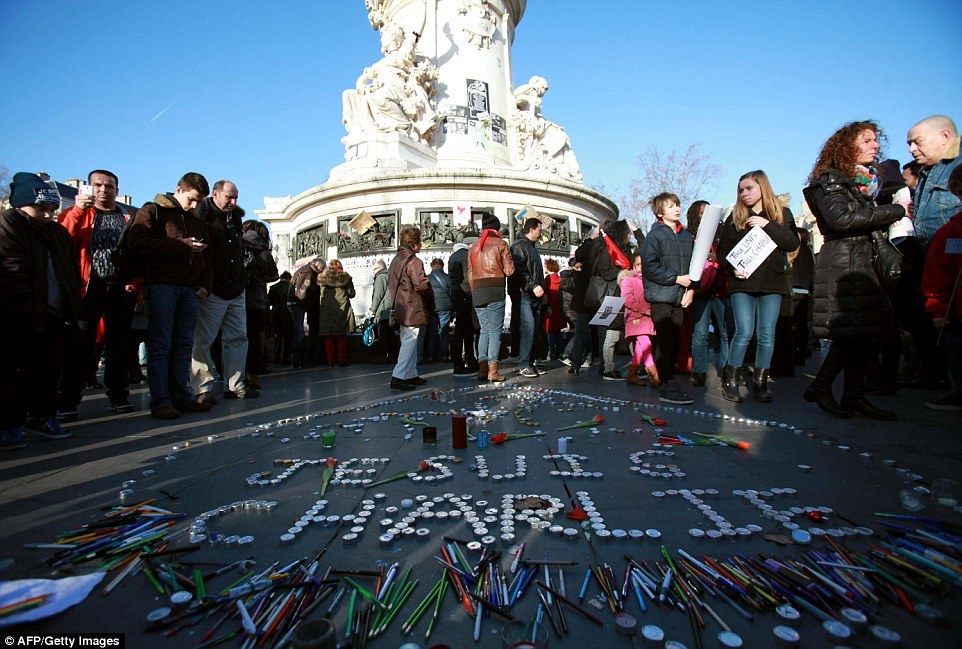 | Người dân cũng xếp chữ bằng các loại bút, tưởng niệm nạn nhân thiệt mạng trong vụ xả súng tại tòa soạn Charlie Hebdo. Trong 3 ngày, thủ đô của Pháp hỗn loạn vì các vụ tấn công đẫm máu liên tiếp xảy ra. Cảnh sát đã tiêu diệt được 3 nghi phạm gây ra những vụ khủng bố chấn động nước Pháp và thế giới. Ảnh: Getty |