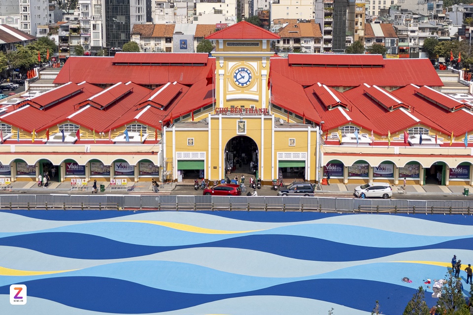 Khu vực quảng trường phía trước chợ Bến Thành nhìn từ trên cao sau khi được chỉnh trang, nổi bật với các mảng màu xanh - vàng uốn lượn trên mặt đường. Ảnh: An Khương. |