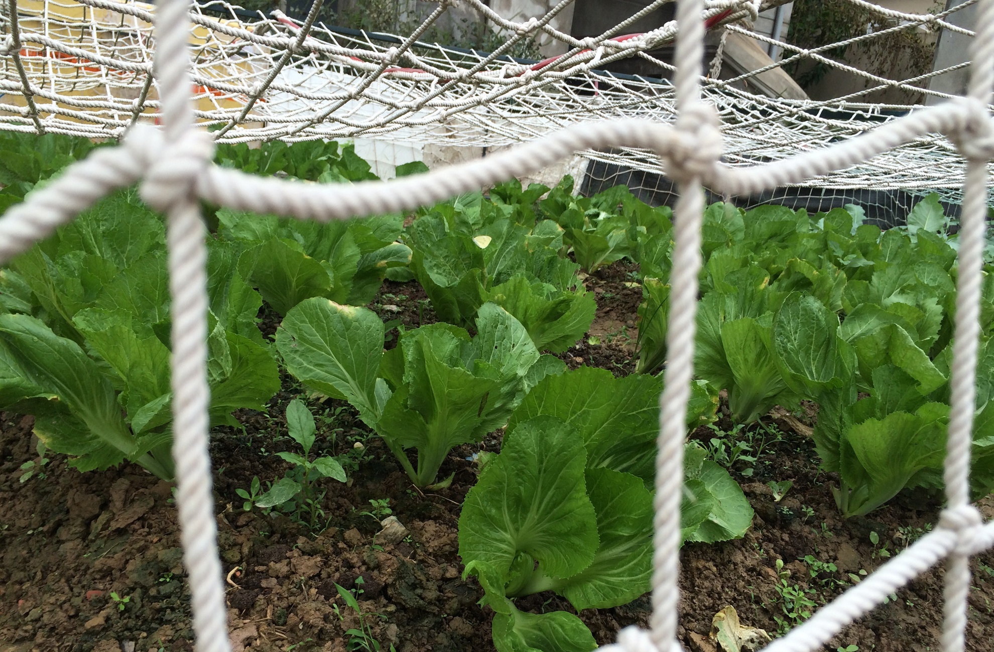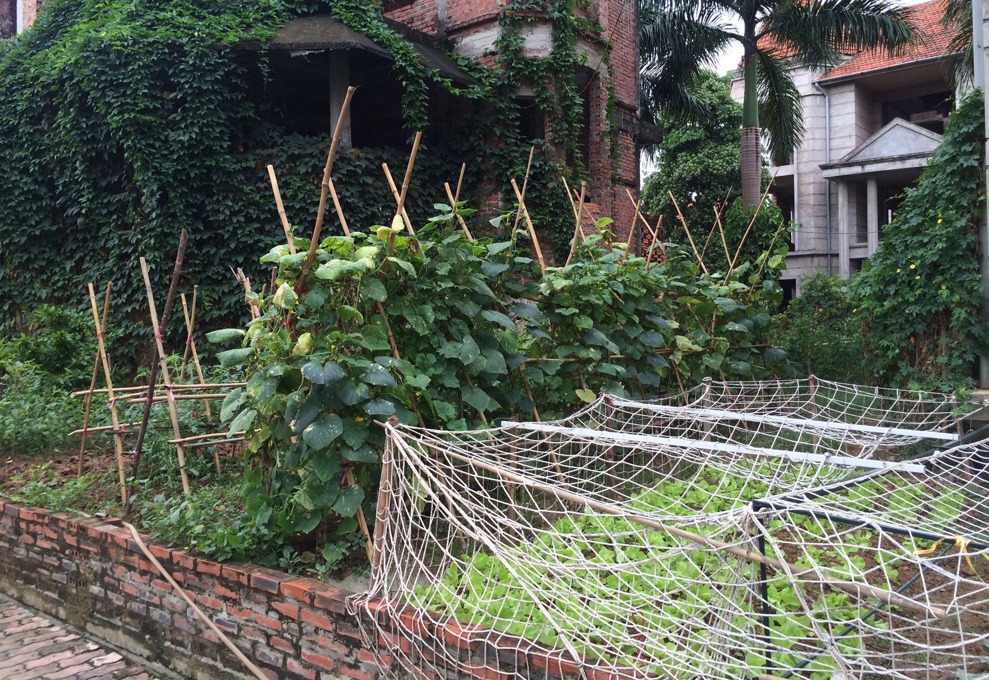 | Những luống cải xanh tốt được quây kín trong sân vườn của các biệt thự bỏ hoang. |