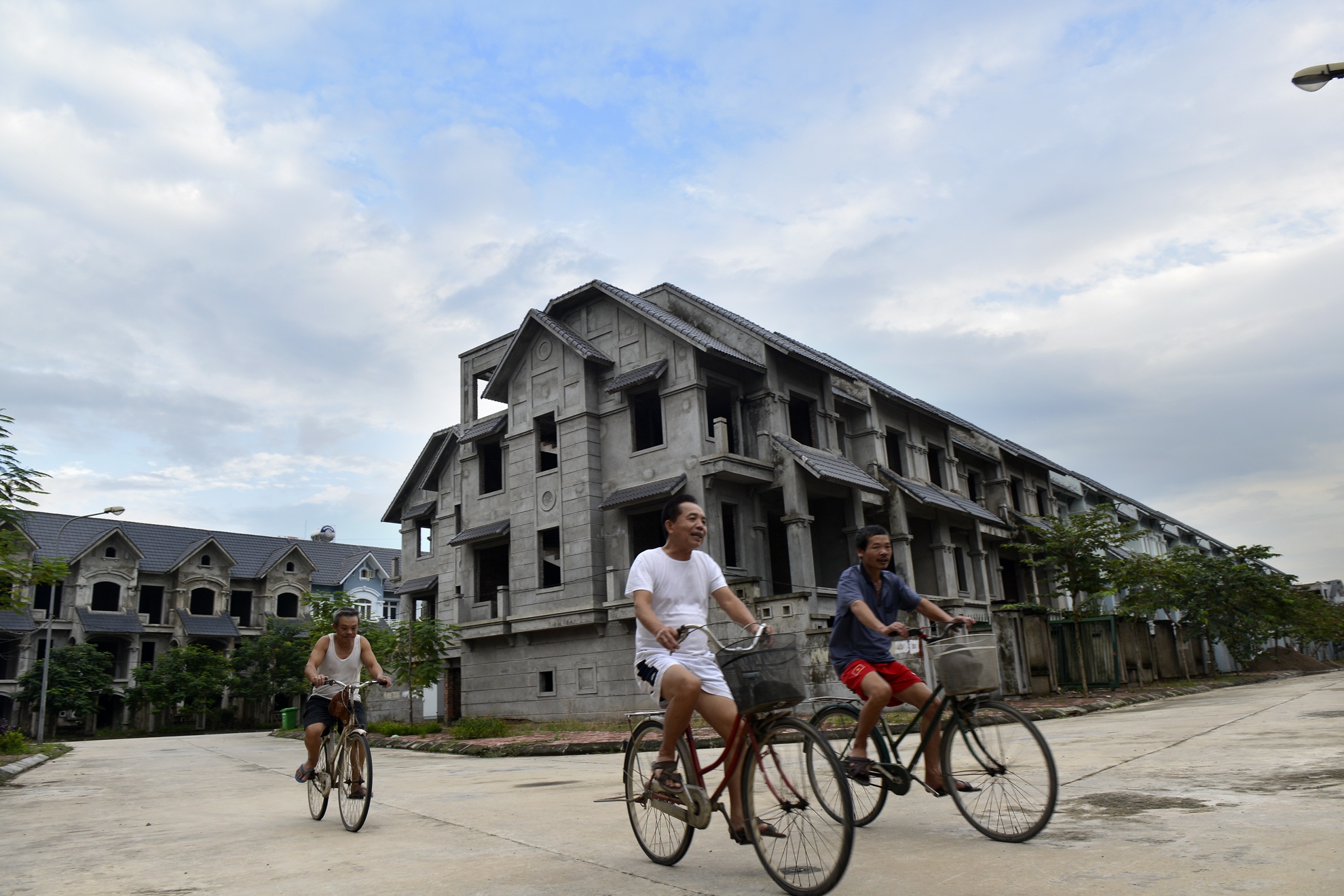 | Buổi chiều, số ít những chủ hộ đã dọn tới ở tại đây bầu bạn cùng nhau, đạp xe thong dong dạo quanh khu biệt thự hoang vắng. |