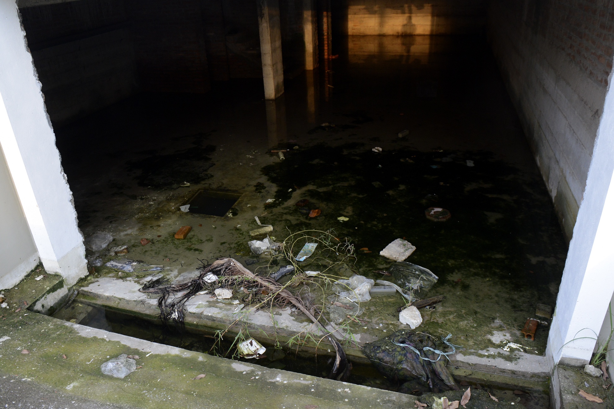 | Khu vực hầm các biệt thự ngập nước nặng kèm theo rác thải do đọng nước mưa nhiều ngày, bốc mùi hôi thối. |