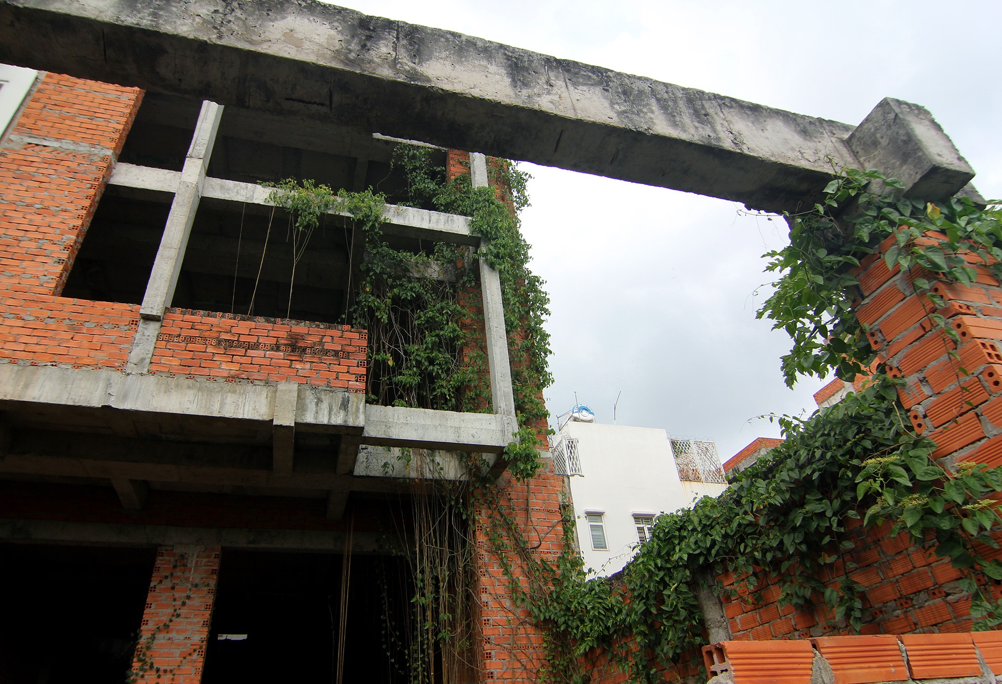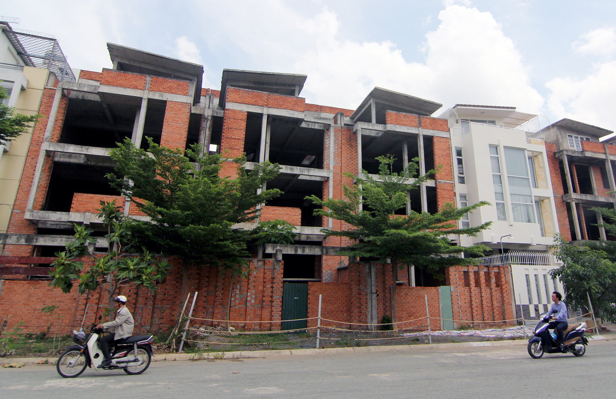 | Các dãy biệt thự cao cấp mang phong cách châu Âu được xây dựng xong phần thô nằm san sát nhau, cỏ mọc um tùm vây quanh tại khu vực đường Trương Văn Bang - Phan Bá Vành, trước trung tâm hành chính quận 2. |