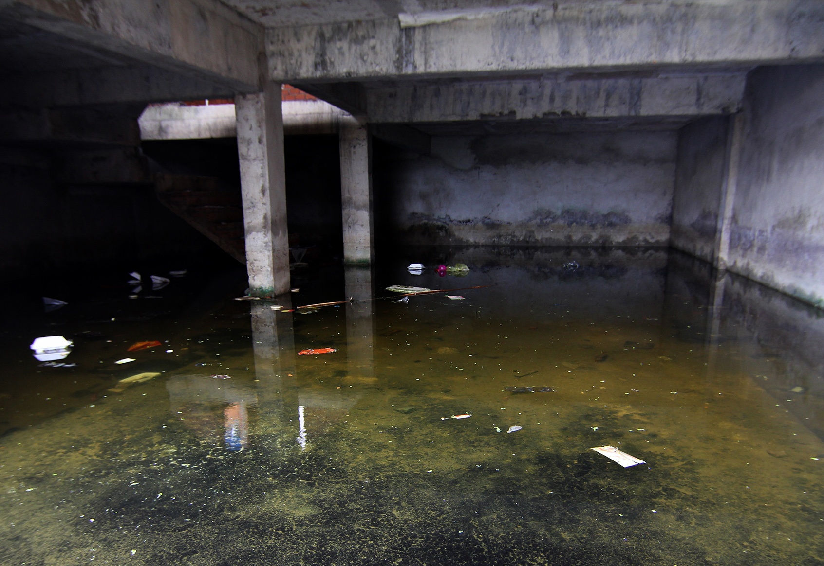 | Bên trong tầng hầm của một ngôi nhà, nước tù đọng thành ao, tường rêu mốc. |