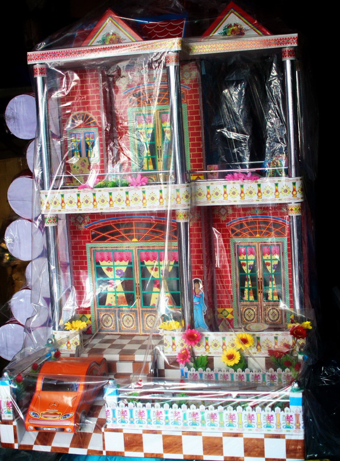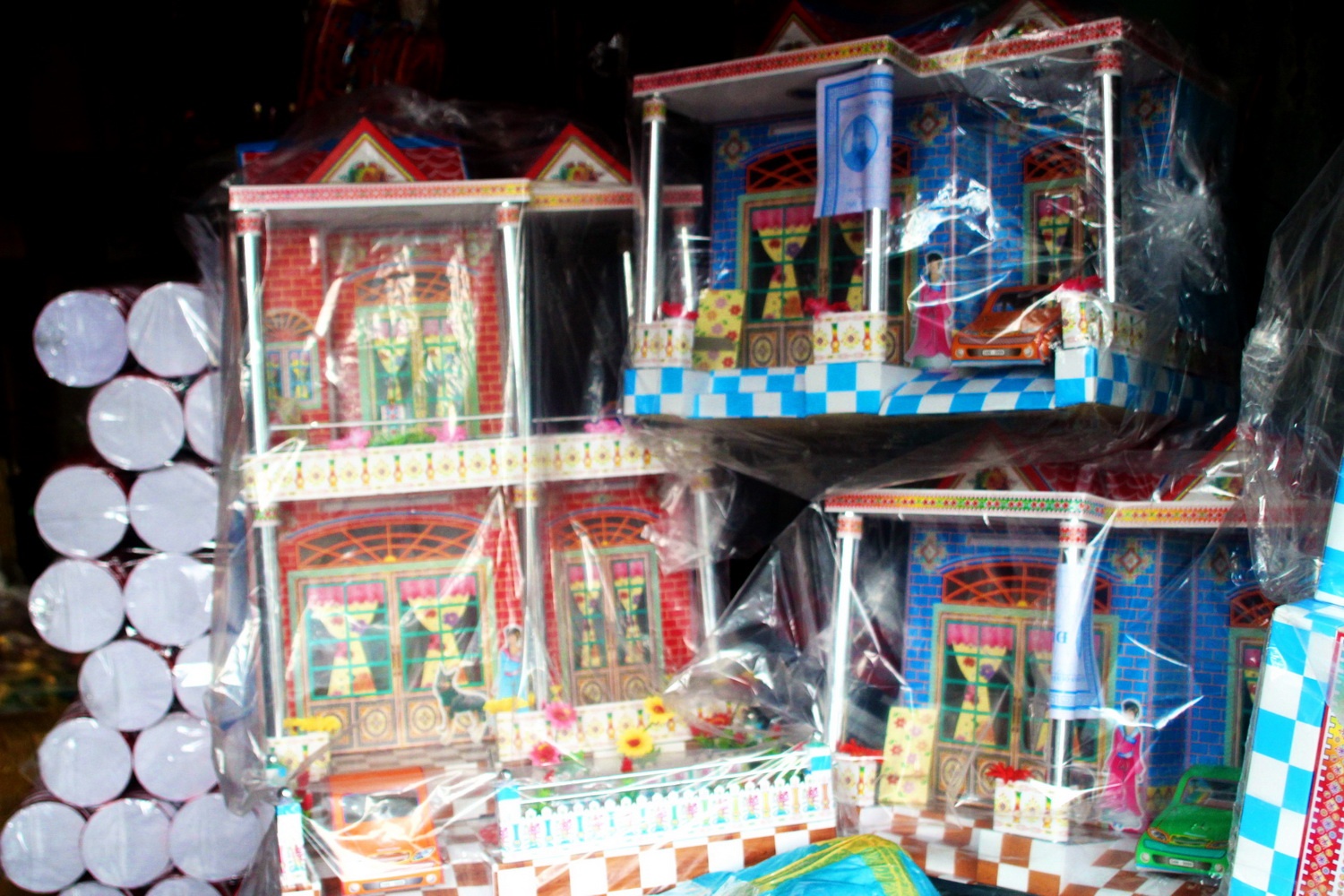 Hàng mã nhà cửa cho người âm có nhiều kiểu dáng, có cả nhà trệt, biệt thự và nhà mặt phố. Biệt thự chủ yếu làm kết cấu 2 tầng, cao khoảng 1m với nhiều màu sắc, có giá từ 200.000 - 500.000 đồng.