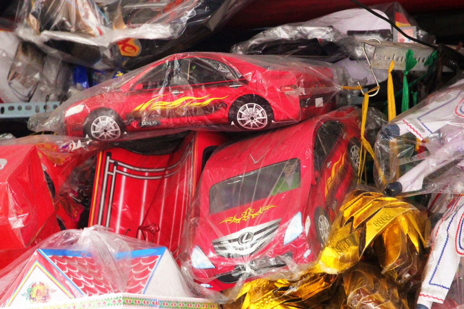 Tại nhiều tuyến đường gần các chợ Thiếc (quận 11), Bình Tây (quận 6), Bà Chiểu (quận Bình Thạnh), Tân Định (quận 1), hàng trăm loại hàng mã, đồ cúng được bày bán. Trong đó ấn tượng nhất là các nhóm hàng “khủng” như biệt thự, xe hơi, xe máy và đồ công nghệ.