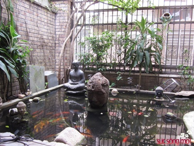 | Nhìn ra bên ngoài là bể cá với rất nhiều tượng Phật. |