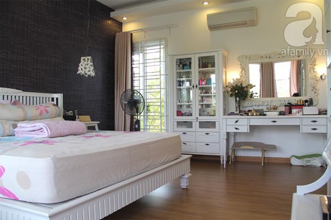 | Phòng ngủ chính của ngôi nhà được thiết kế theo phong cách Tân cổ điển với đa phần các món nội thất mang phong cách châu Âu. Nổi bật trong căn phòng màu trắng là bức tường tối màu có họa tiết mềm mại. Không chỉ được bài trí cẩn thận để phục vụ cho nhu cầu giải trí, nghỉ ngơi, nhờ sở hữu 2 mặt thoáng lớn nhìn ra không gian xanh, căn phòng thực sự rất thư giãn. |