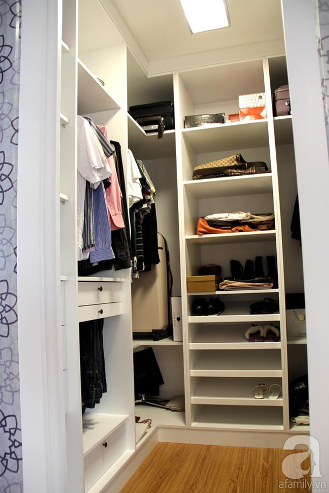 | Phòng thay đồ tách biệt phòng ngủ với hệ kệ tủ được đặt riêng để đáp ứng nhu cầu lưu trữ quần áo, phụ kiện của chủ nhân. |