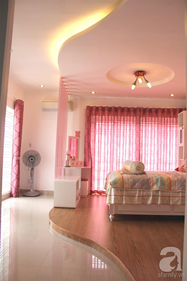 | Phòng ngủ của bé Cherry là sự kết hợp 2 gam màu trắng và hồng, tạo nên không gian cổ tích đa chức năng và rất nữ tính, trong sáng. Sự cầu kỳ trong trang trí khiến căn phòng này thực sự là giấc mơ cổ tích của mọi cô bé. |