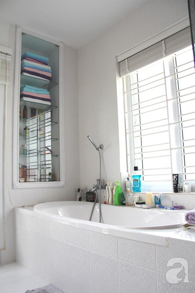 | Phòng tắm hiện đại với tủ âm tường lớn để lưu trữ khăn, đồ dùng tiện lợi. Những khung cửa sổ lớn với ánh sáng ngập tràn giúp căn phòng thêm thư giãn. |