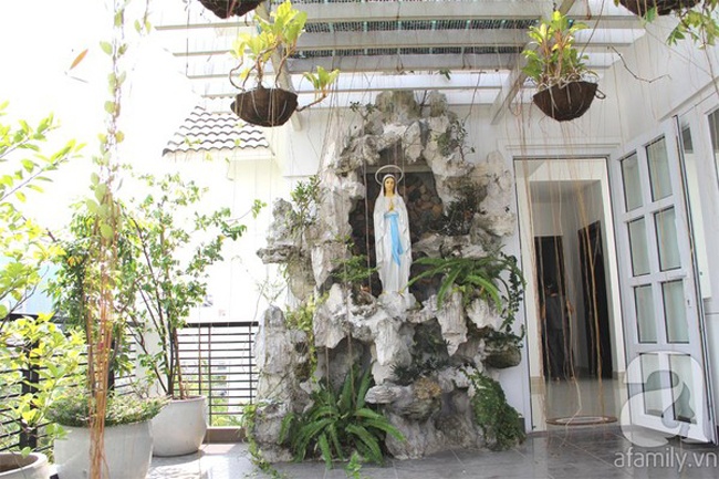 | Một phần không gian trên lầu được sử dụng để làm vườn treo những chậu lan, cây cảnh đẹp mắt. |