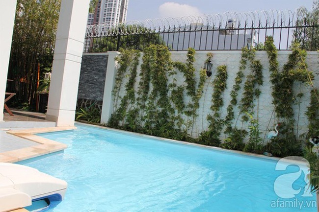 Bể bơi bố trí sau nhà được bao bọc bởi những cây trúc.