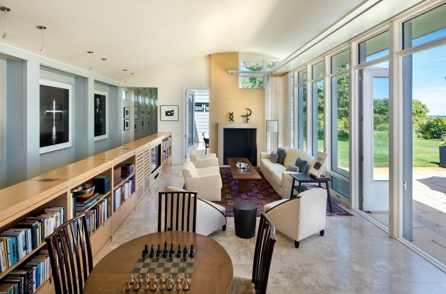 | Phòng giải trí gồm kệ sách và bàn chơi cờ vua. |