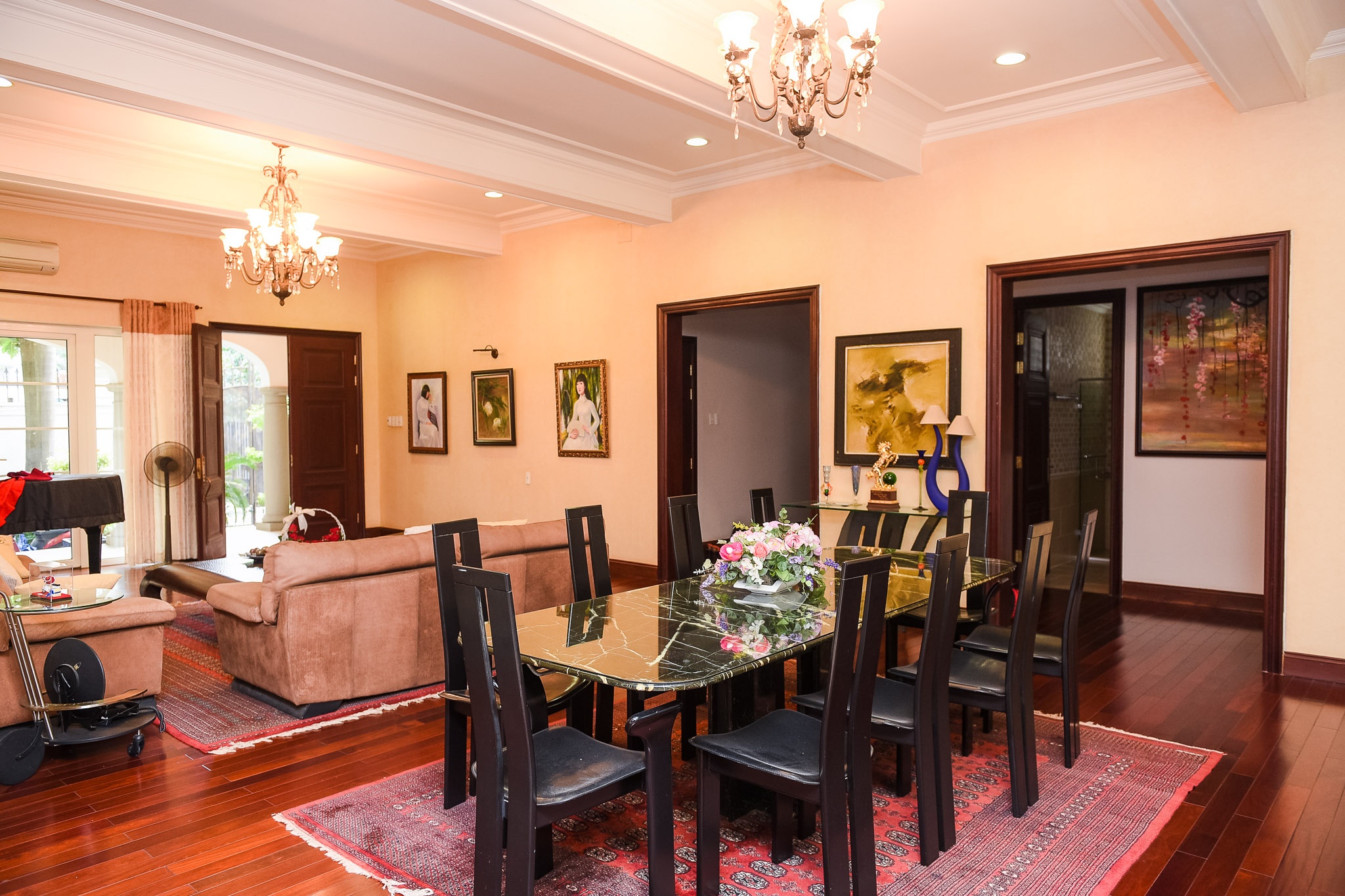 | Phòng ăn nối liền với phòng khách, được chủ nhân tô điểm bằng những bức tranh, bình hoa. Hiền Mai cho biết, chị bị ghiền sắm đồ nhà bếp. Mỗi lần đi Mỹ, đồ chị mua nhiều nhất không phải quần áo, mỹ phẩm mà là chén bát. |