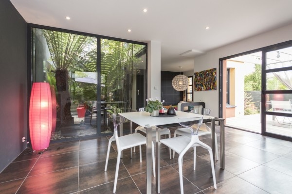 Phòng khách được ngăn cách với không gian bên ngoài bằng cửa trượt. |
