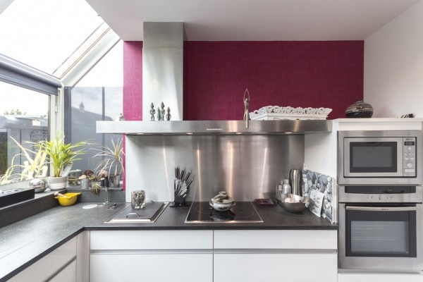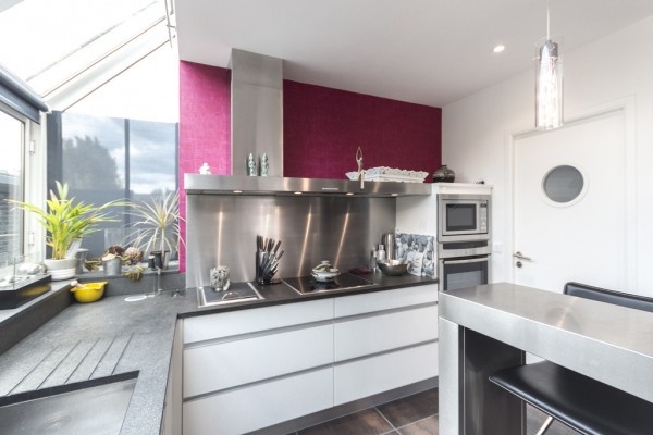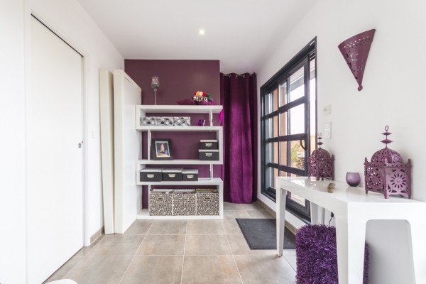 Tường màu ghi và ghế sofa cùng tông giúp nổi bật các màu sắc tươi sáng và năng động. |