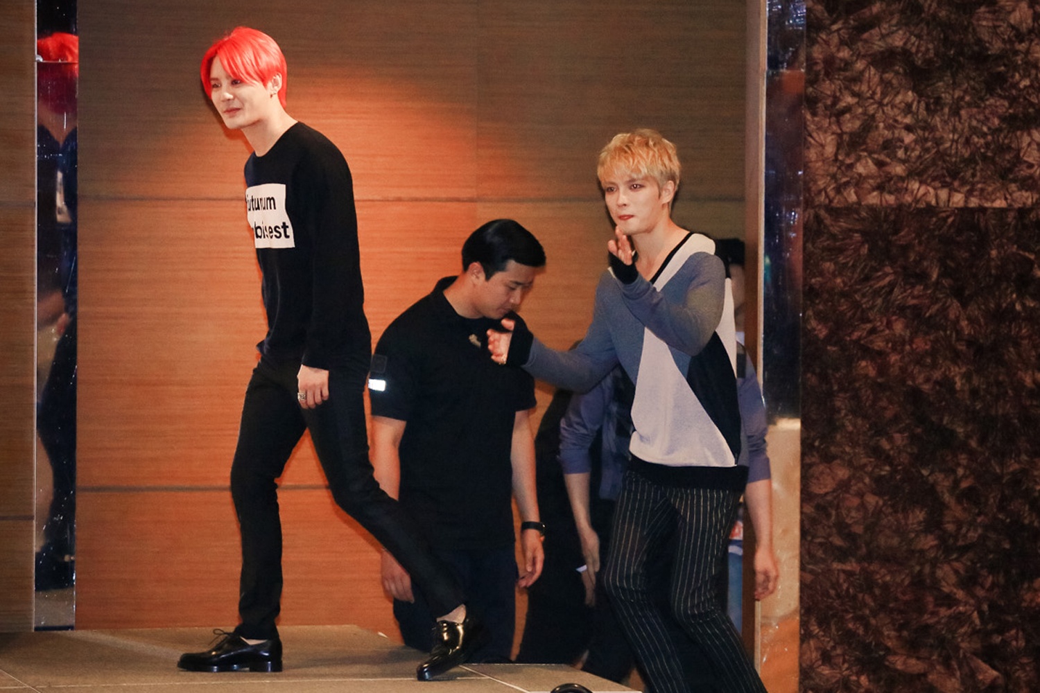 | Đúng 16h, 3 thành viên nhóm JYJ xuất hiện trong buổi họp báo. Các thành viên vui vẻ chào các phóng viên có mặt tại đây. |