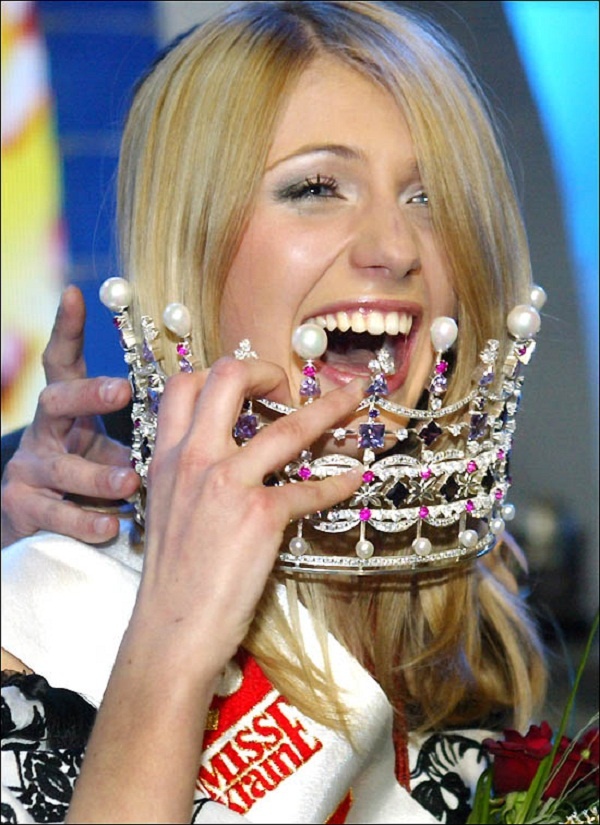 Hoa hậu Ukraine 2005 vẫn “tươi không cần tưới” dù chưa biết có thể nhấc được chiếc vương miện ra khỏi cổ không. |