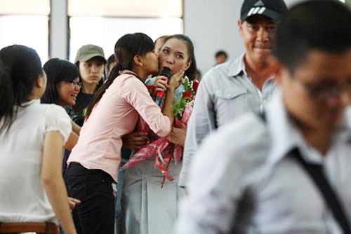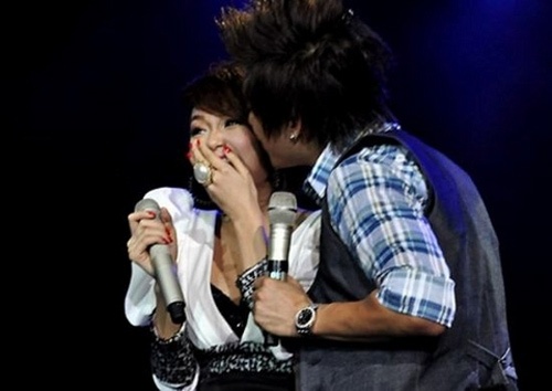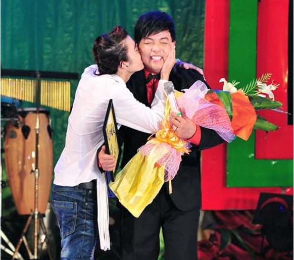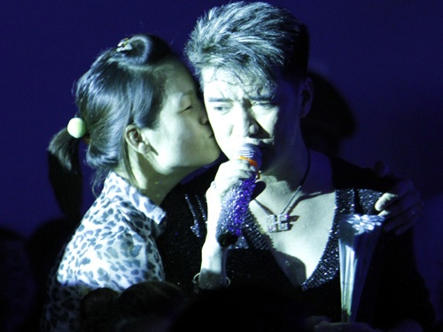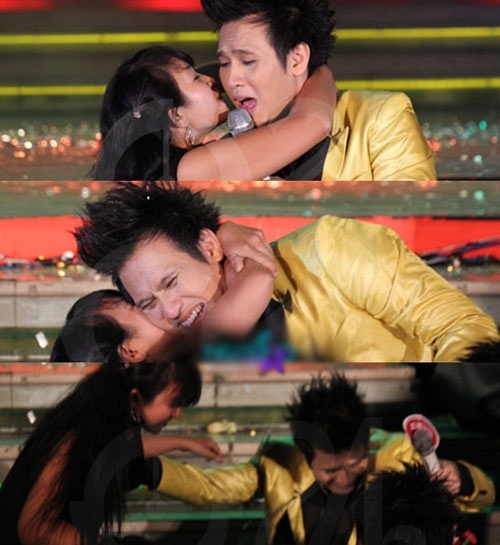 | Là người của công chúng, các nghệ sĩ Việt phải tập thích nghi với những tình huống dở khóc dở cười khi đứng trên sân khấu, thế nhưng, không ít trường hợp, họ phải sợ đến xanh mặt khi bị người hâm mộ cưỡng hôn bất ngờ. Dù rất trân trọng tình cảm các fan, nhưng Quang Lê vẫn cảm thấy bị động trong tình huống này. Gương mặt anh đầy cam chịu và ngượng ngùng.