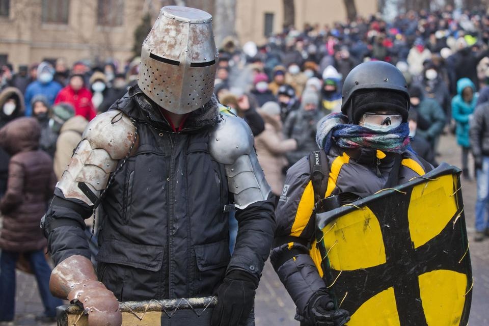| Thoạt nhìn ảnh, có lẽ nhiều người sẽ tưởng hai chiến binh thời trung cổ đang xuất hiện trong một phim nào đó. Nhưng thực ra họ là hai người biểu tình chống chính phủ Ukraina tại thủ đô Kiev hôm 20/1. Ảnh: AP |