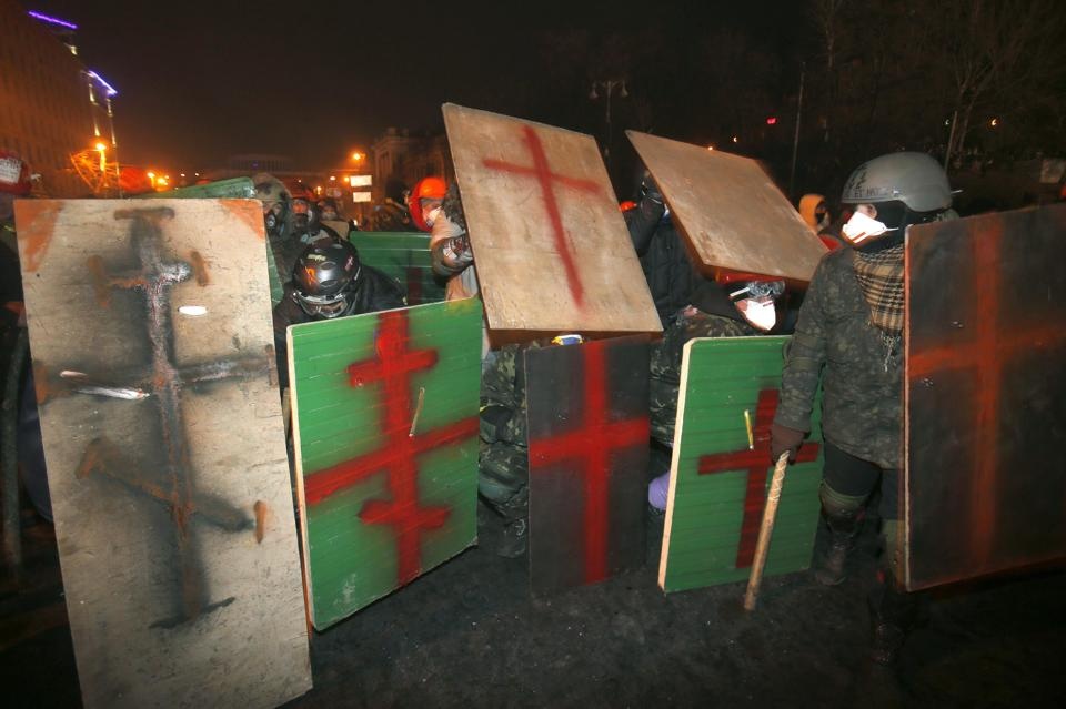 | Đám đông dùng những lá chắn bằng gỗ để chuẩn bị đối phó cảnh sát tại Kiev hôm 21/1. Ảnh: AP |
