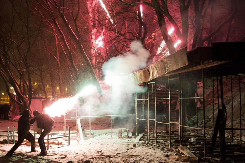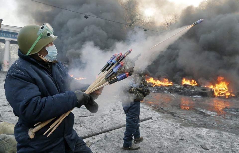 | Một người biểu tình dùng súng trong cuộc đụng độ với cảnh sát ở Kiev hôm 22/1. Ít nhất 3 người đã chết vì bạo lực. Ảnh: AP |