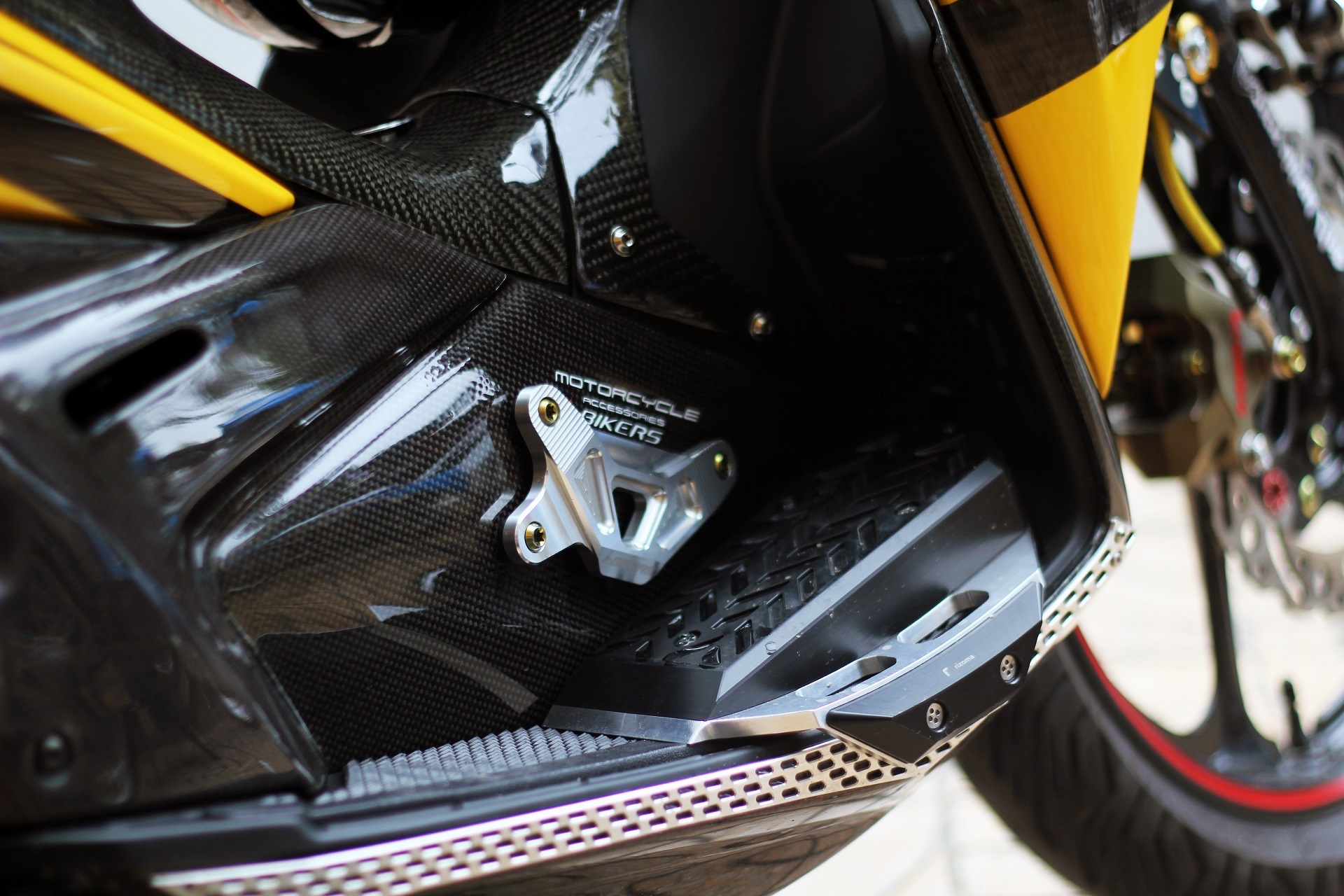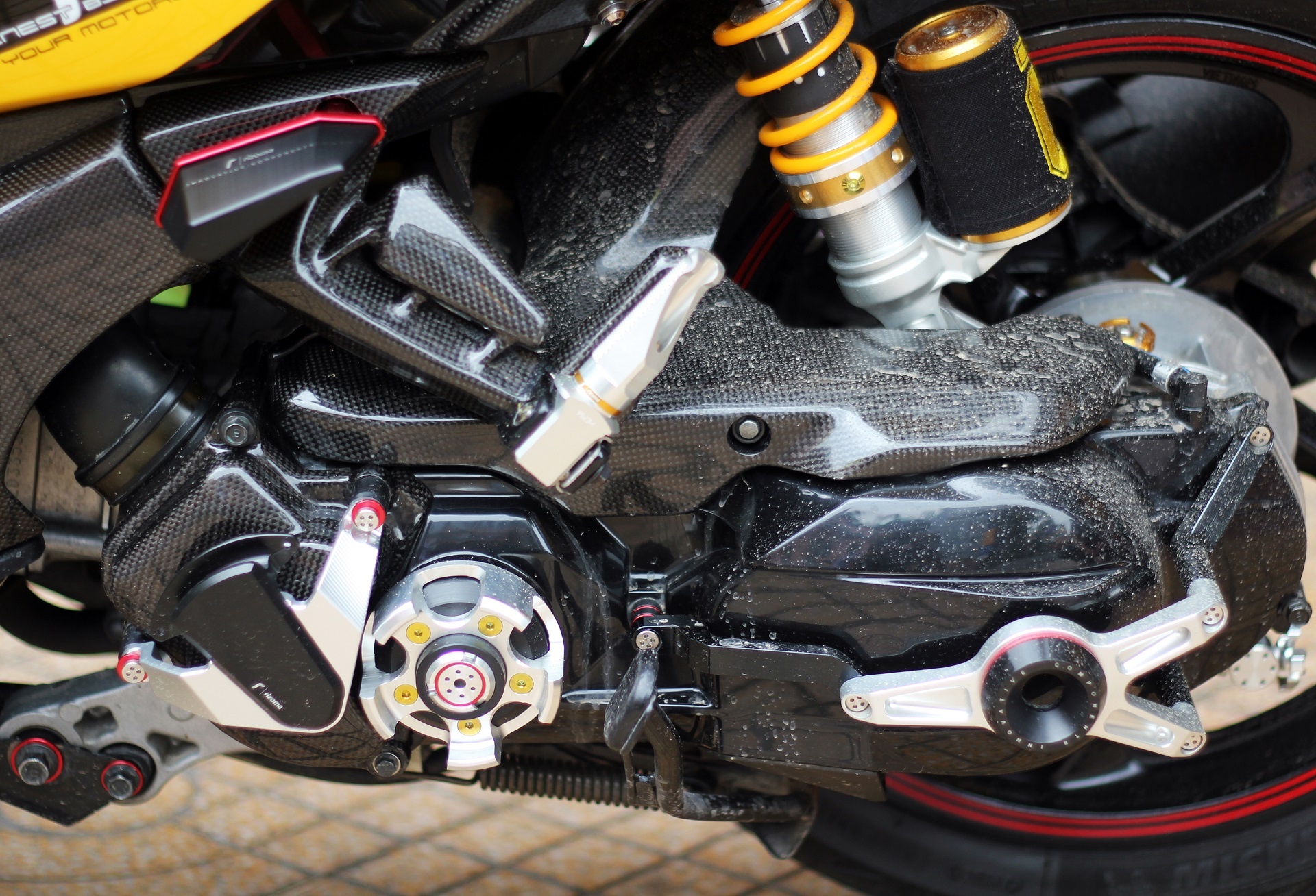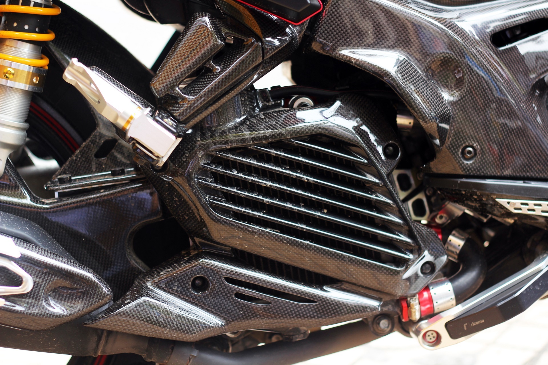 | Bộ phận két dầu tản nhiệt cũng được bọc sợi carbon. Bên dưới gắn chống đổ Rizoma của Kawasaki Z1000. |
