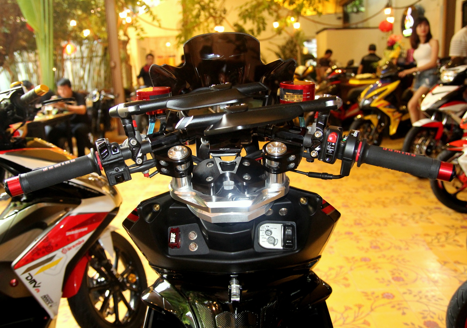 | Đây là phần đầu chiếc Air Blade Thái được độ khá cầu kỳ, như tay lái nhôm cắt CNC, gương độ gập vào trong, tay lái Domino, bình dầu Rizoma... |