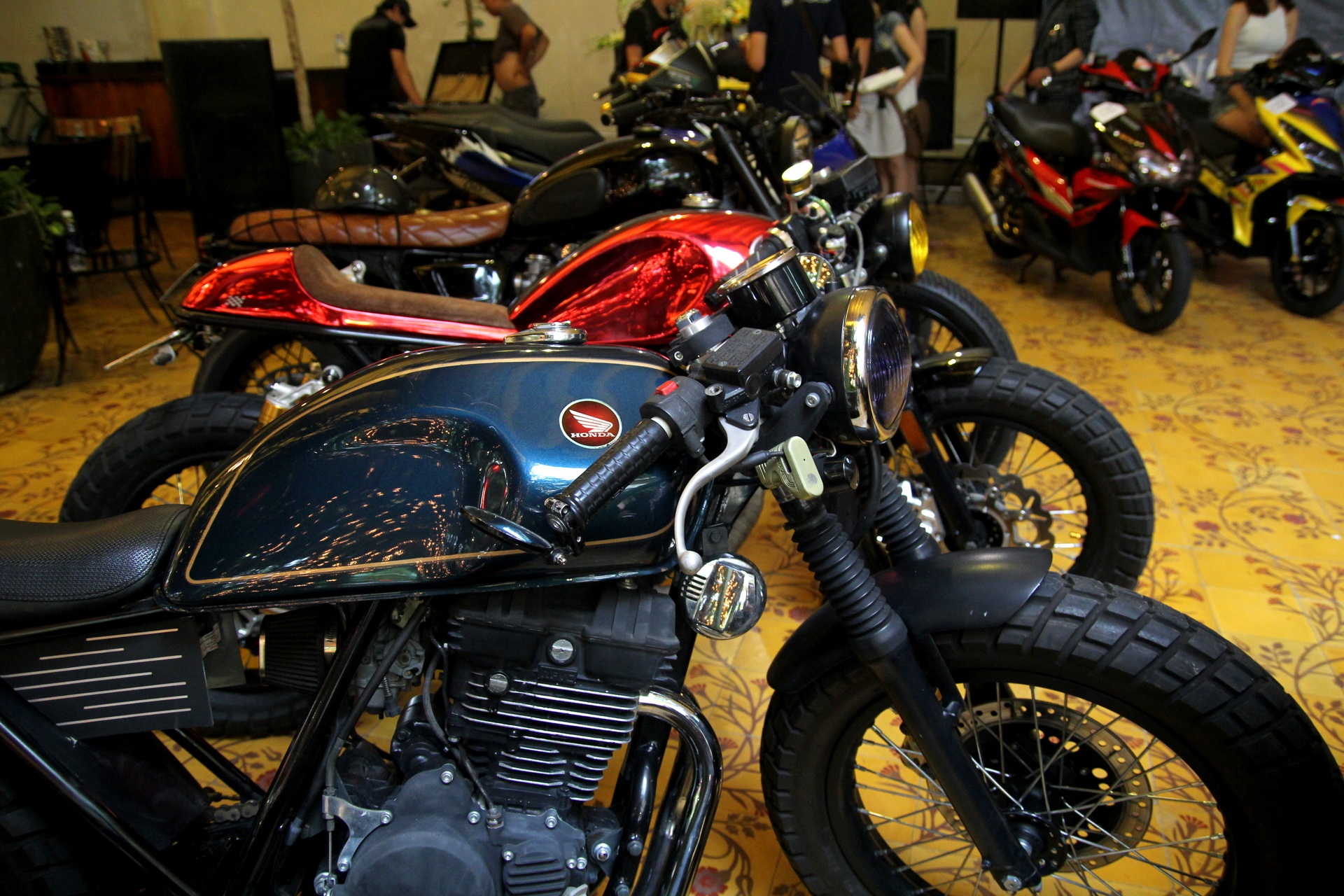 | Hai chiếc Honda và một chiếc Triumph độ theo phong cách cafe racer. |