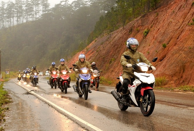Vận hành khi đi tour, Exciter 150 cho khả năng tăng tốc nhanh. Cảm giác đang ở số 4 với vận tốc 60-70 km/h, khẽ tăng ga, tốc độ có thể tăng lên 90-100 km/h. Do trời mưa, đường trơn nên tốc độ tối đa anh Nghĩa thử là 110 km/h.
