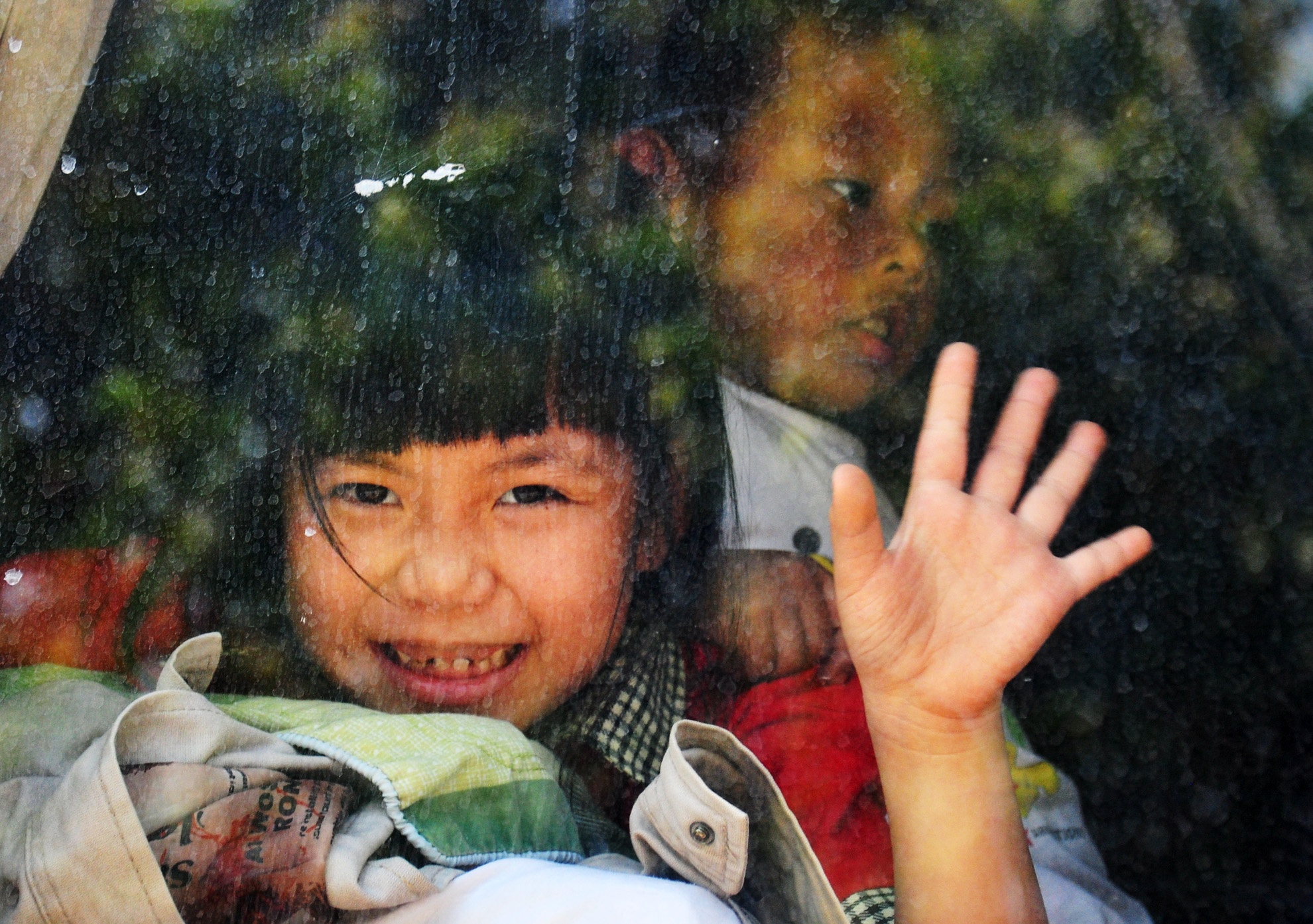 | Bé Hạnh (6 tuổi) vẫy tay chào người thân theo cha mẹ "hành phương Nam" sau những ngày nghỉ tết. |