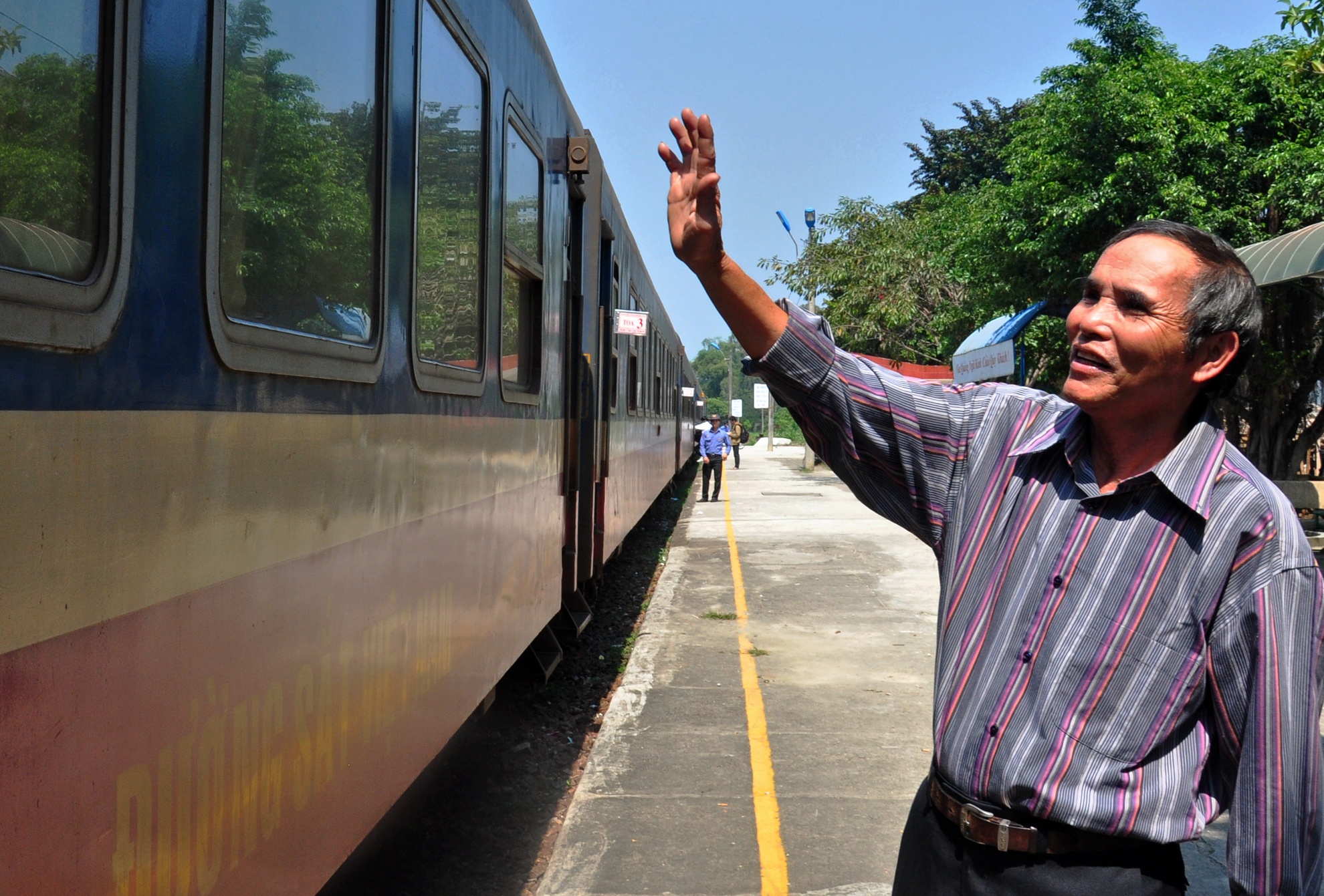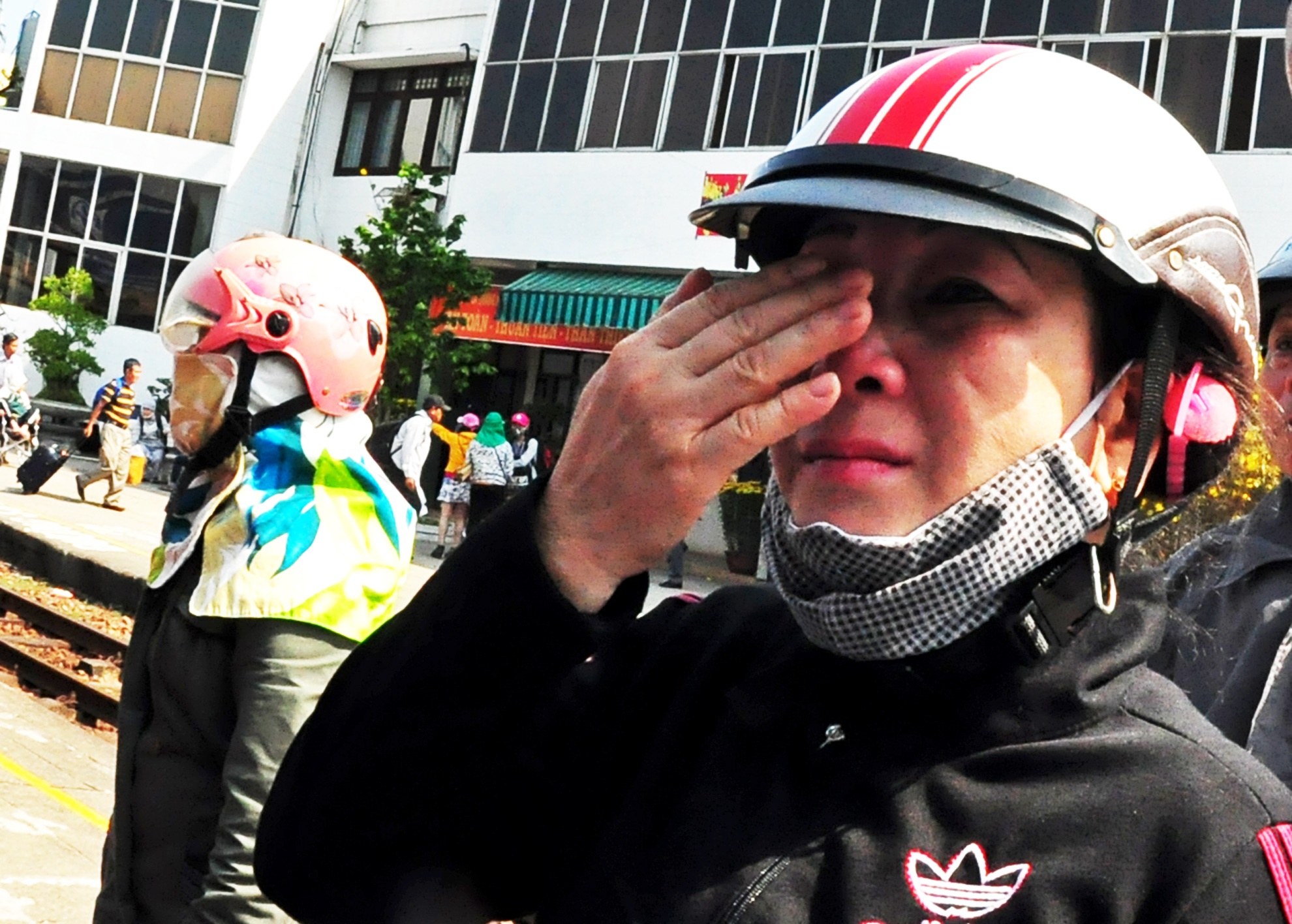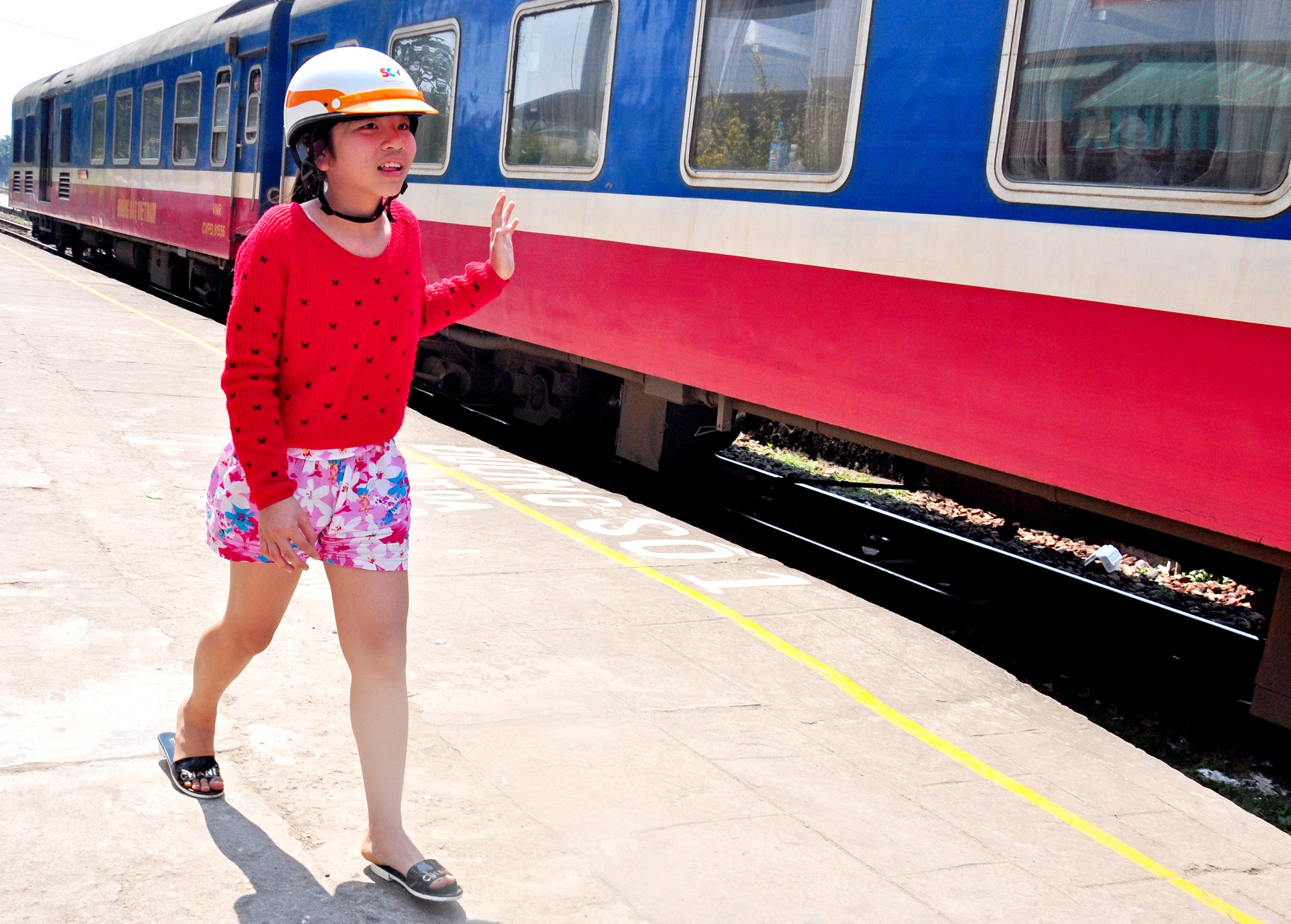 | Bé Nguyễn Cao Sao Khuê (11 tuổi, ngụ phường Quảng Phú, TP Quảng Ngãi) chạy theo đoàn tàu lăn bánh rời ga gọi tên hai em (con dì). "Hai con của Dì mới về thăm hôm mùng 2 tết, vui đùa với nhau mới ít ngày mà nay hai em đã về lại Đà Nẵng nên cháu buồn lắm", bé Khuê nói. |