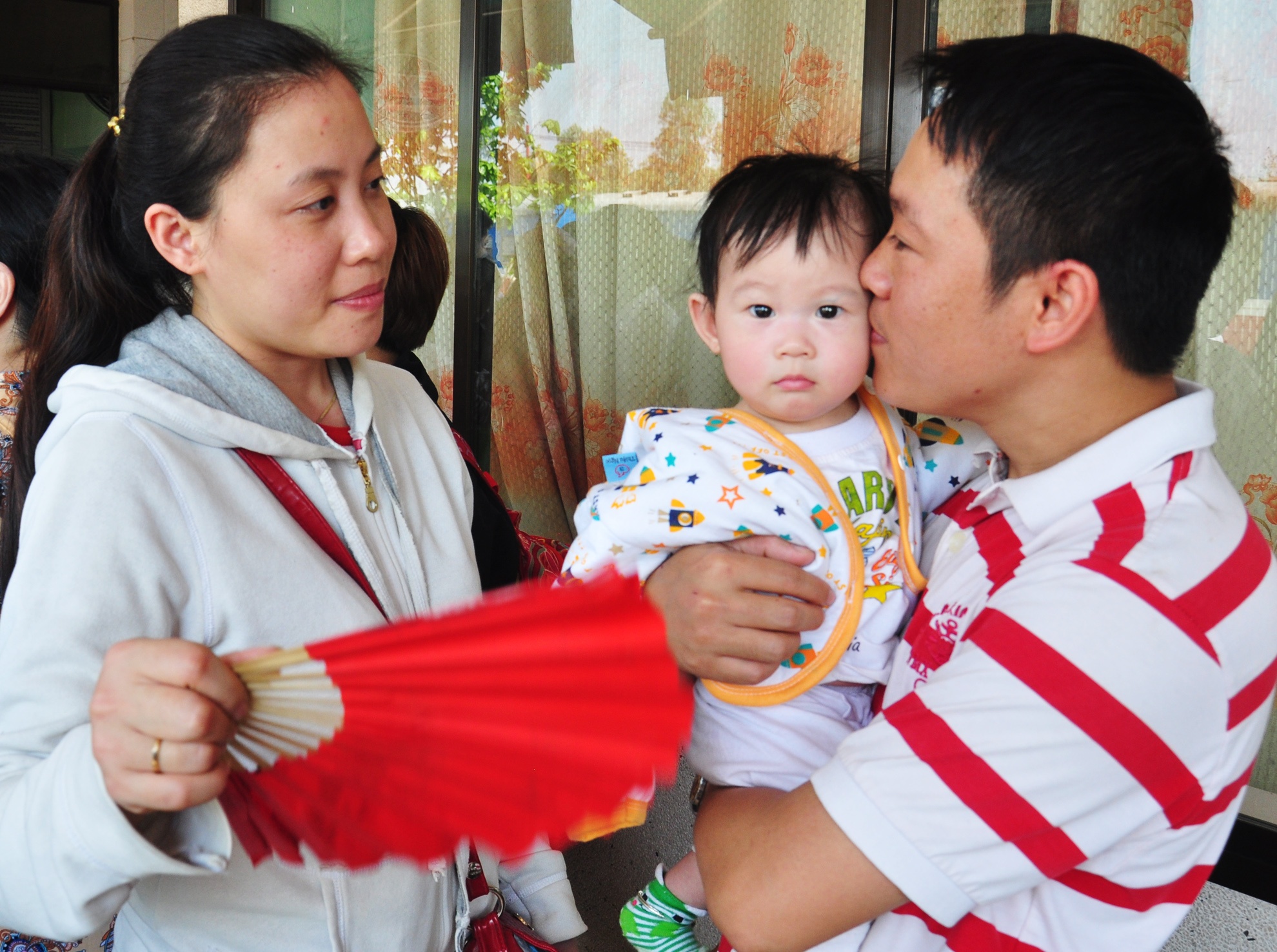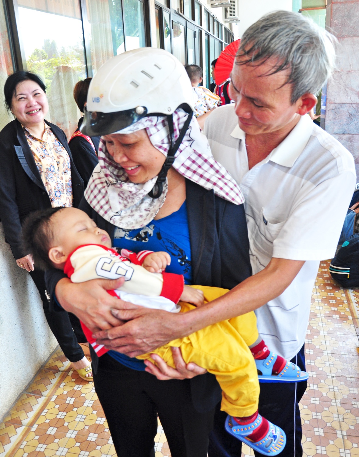 | Vợ chồng ông Võ Duy Trinh (ngụ phường Trần Phú, TP Quảng Ngãi) âu ếm, nựng nịu cháu trai Võ Khôi Nguyên (1 tuổi) trước khi cùng cha mẹ lên tàu rời quê Quảng Ngãi sau những ngày tết. |