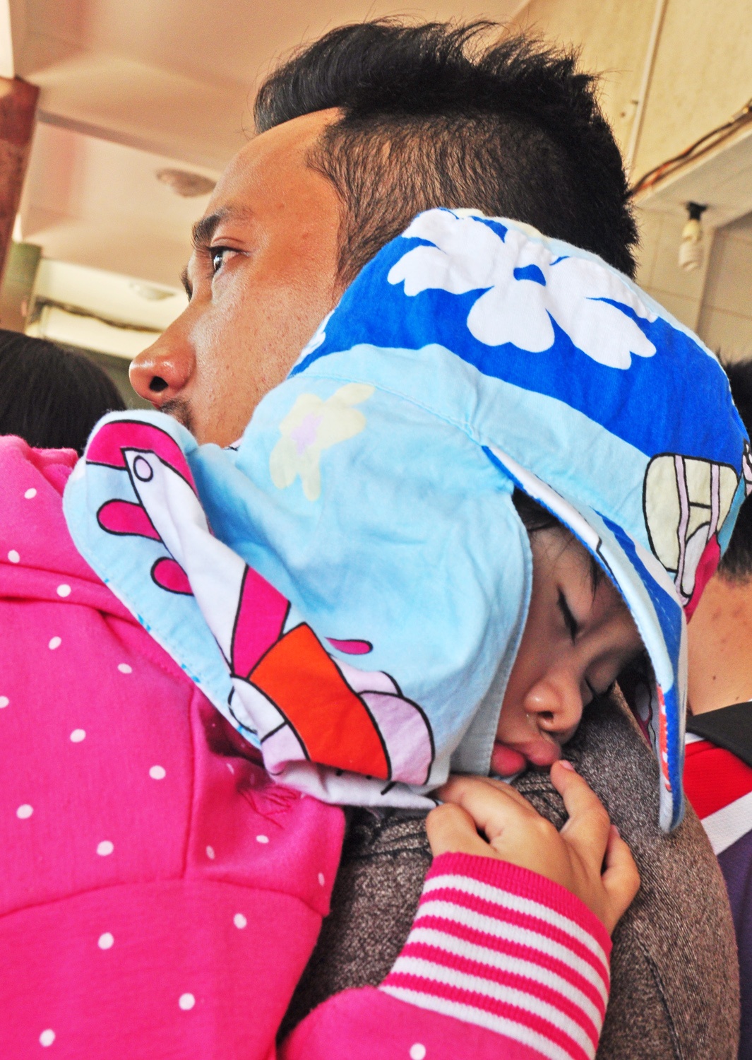 | Bé gái Đinh Tâm Như (3 tuổi) ngủ ngon lành trên vai cha ở ga Quảng Ngãi. Anh Đinh Duy Tiên (cha bé Như) bộc bạch, do con gái còn nhỏ nên hai vợ chồng đành phải gửi lại cho ông bà nội ở quê nhà chăm sóc để vào TP HCM lập nghiệp. Sau thời gian ổn định, con gái sẽ được đón vào sau. |